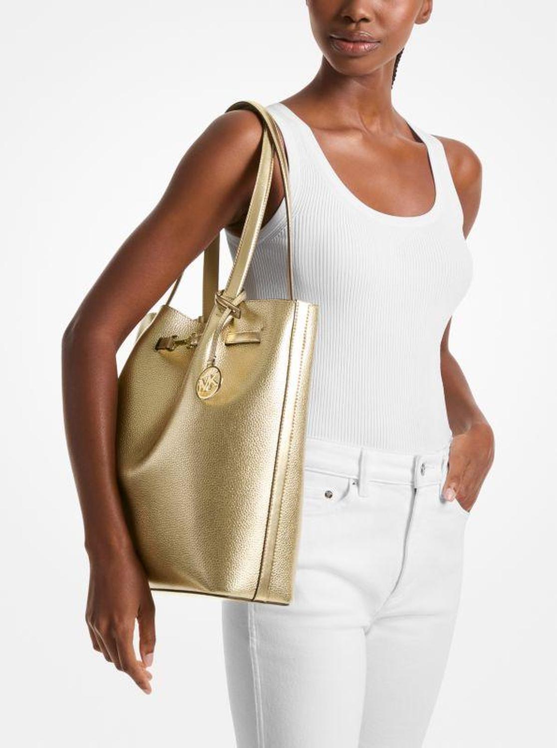 Michael Kors—defining modern glamour since 1981. • Shoulder bag • Metallic pebbled leather • 100% leather • Gold-tone hardware • 12.5"W X 13.5"H X 5"D • Handle drop: 10.5" • Interior details: back slip pocket • Snap fastening • Dust bag not included • Imported • Shoulder bag • Metallic pebbled leather • 100% leather • Gold-tone hardware • 12.5"W X 13.5"H X 5"D • Handle drop: 10.5" • Interior details: back slip pocket • Snap fastening • Dust bag not included • Imported