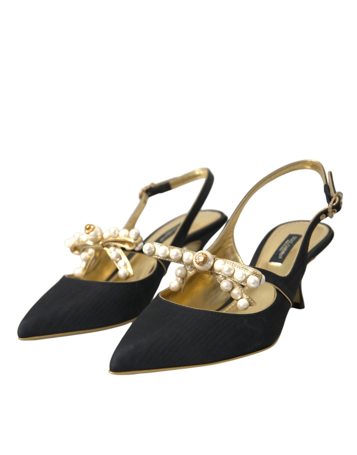 Dolce & Gabbana Black Leather Faux Pearls Slingbacks Shoes
