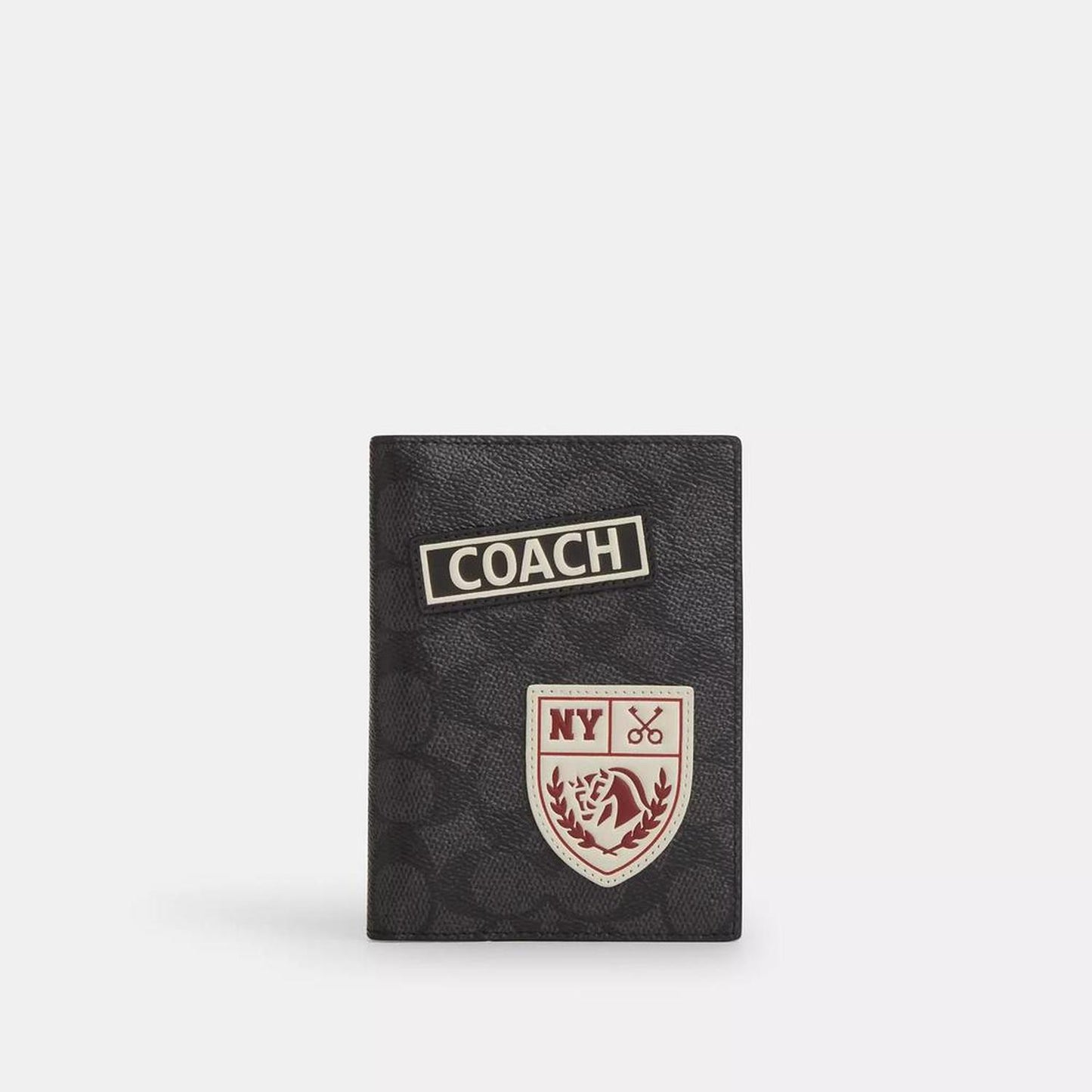 Signature coated canvas Six credit card slots Inside zip and open pockets 4 1/4 (L) x 5 1/2 (H) x 3/4 (W) Style No. CY902 | Coach Outlet Passport Card Case In Signature Canvas With Patches - Grey