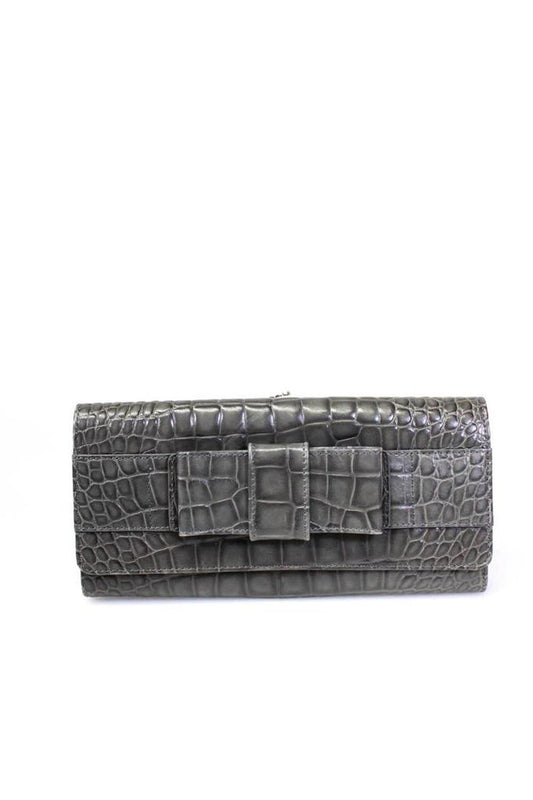 Michael Kors Leather Alligator Embossed Bow Accent Medium Envelope Clutch Gray