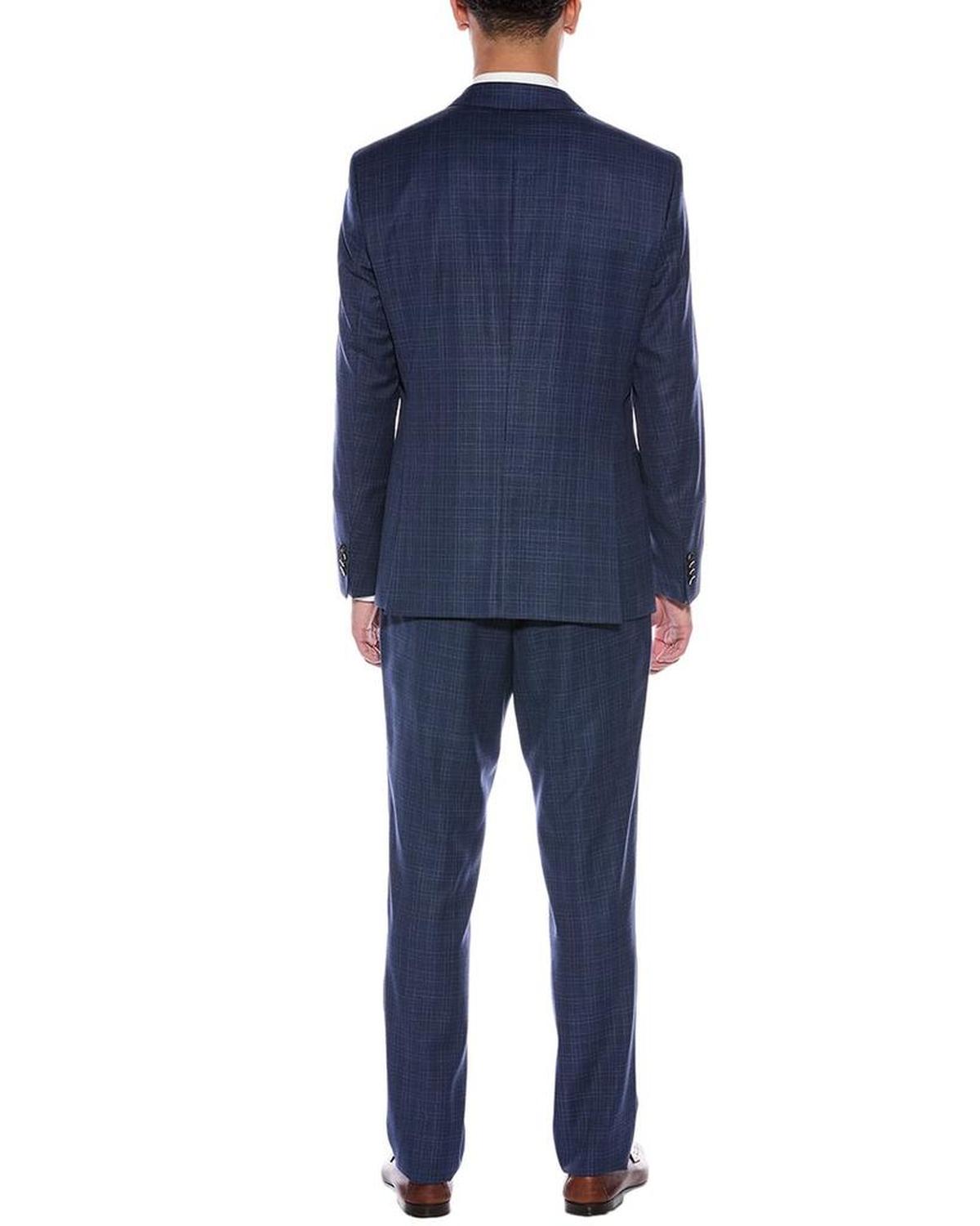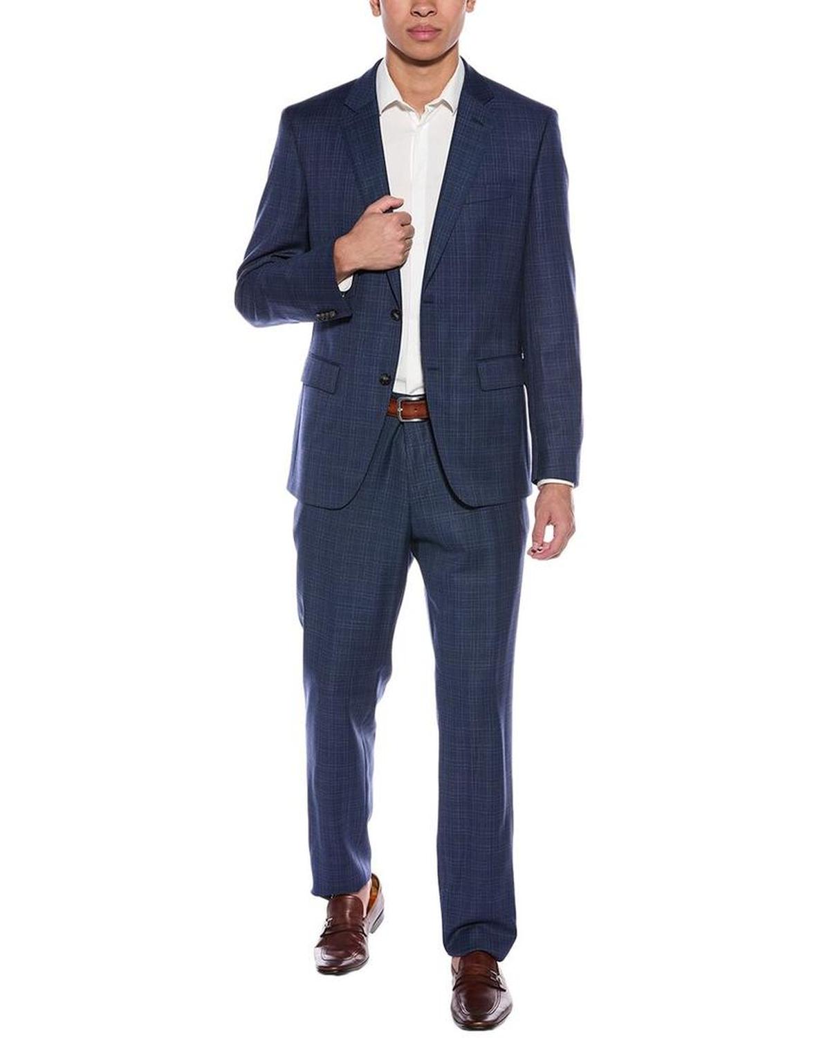 Elevate your formal wardrobe with the BOSS Hugo Boss 2pc Huge Slim Fit Wool Suit. This sophisticated suit features a medium blue color/pattern, notch lapel jacket with left chest pocket, two front pockets, and side vents at the back hem. The jacket has a two-button closure and measures approximately 29in from shoulder to hem. The suit comes with size 34 pants for a size 40 jacket, with an unfinished hem for easy tailoring. Made from 100% virgin wool shell and lined with 65% viscose and 35% polyester, this suit is both luxurious and comfortable. Perfect for any formal occasion, this imported suit is dry clean only. Model is 6'2.5 and is wearing a size 40R. Measurements may vary slightly by size.