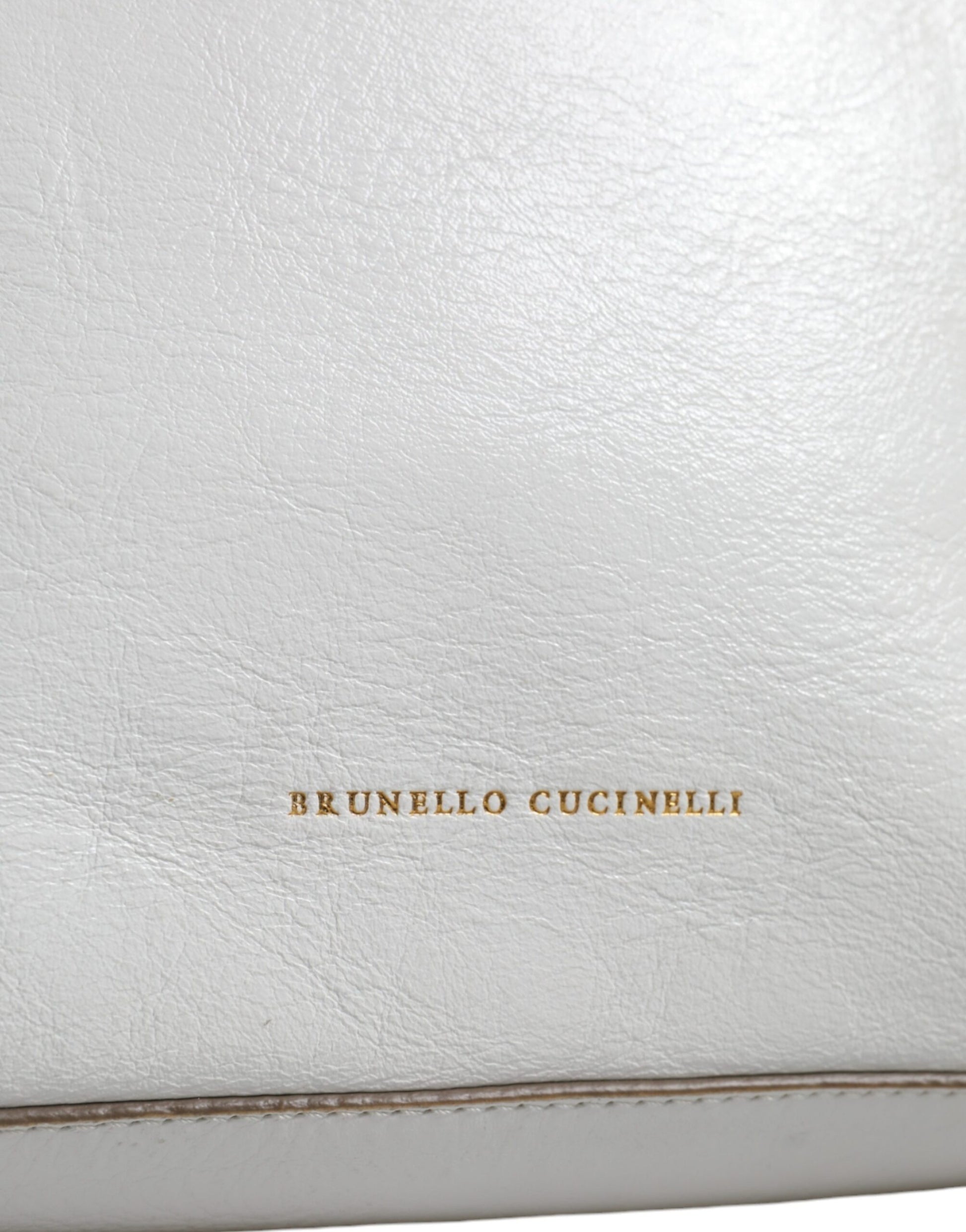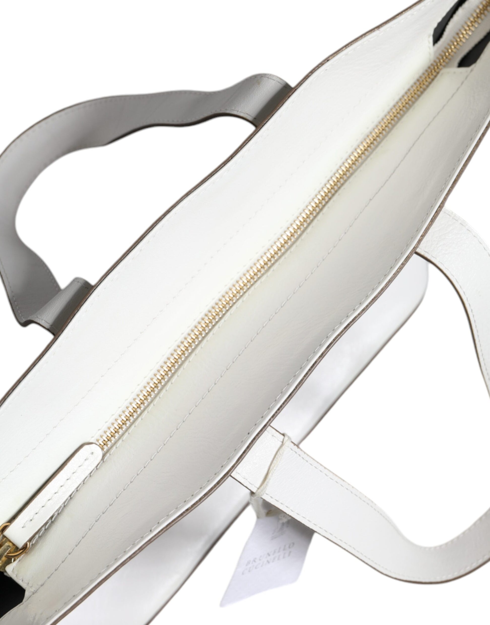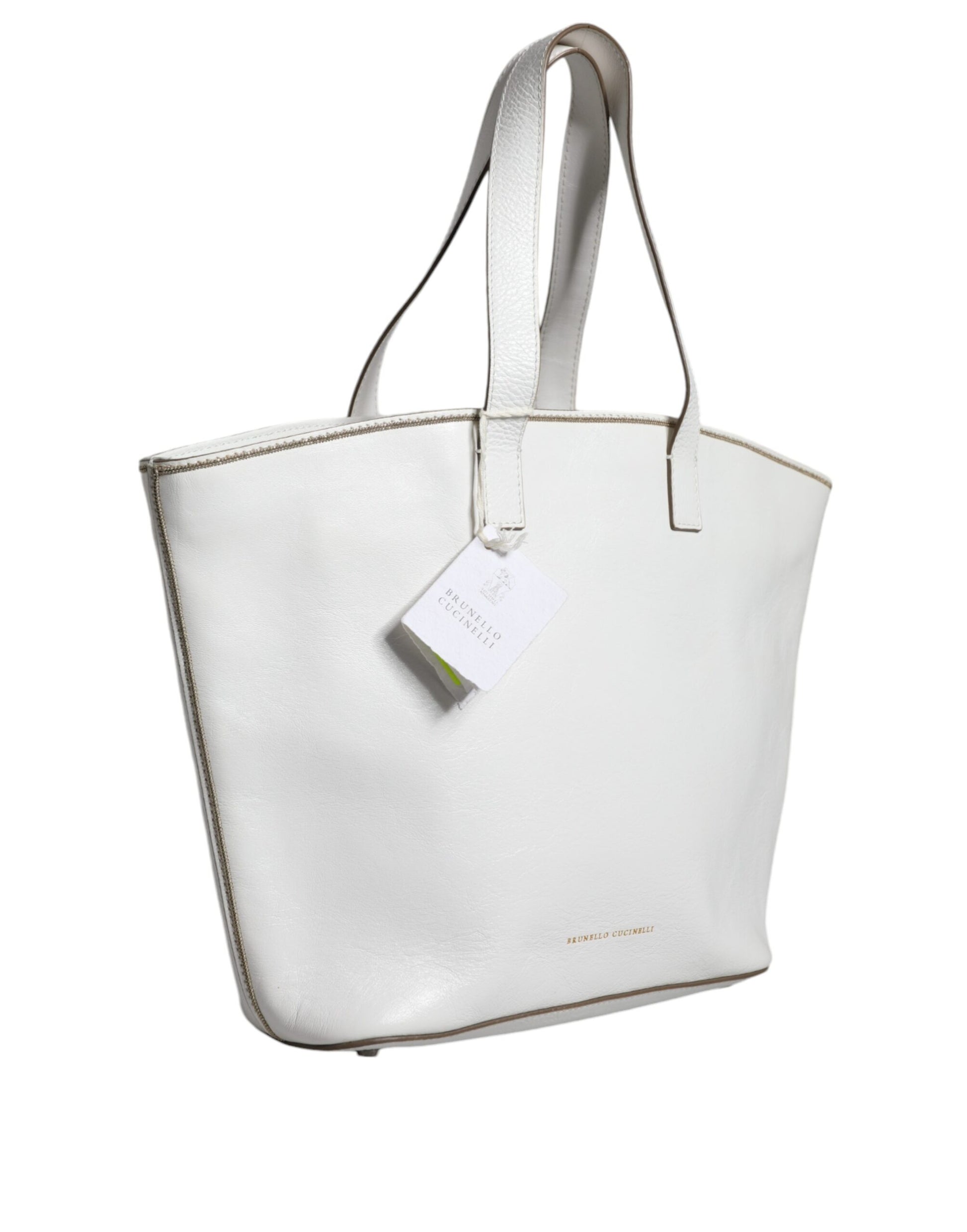 Brunello Cucinelli White Leather Logo Shoulder Strap Shopping Tote Bag