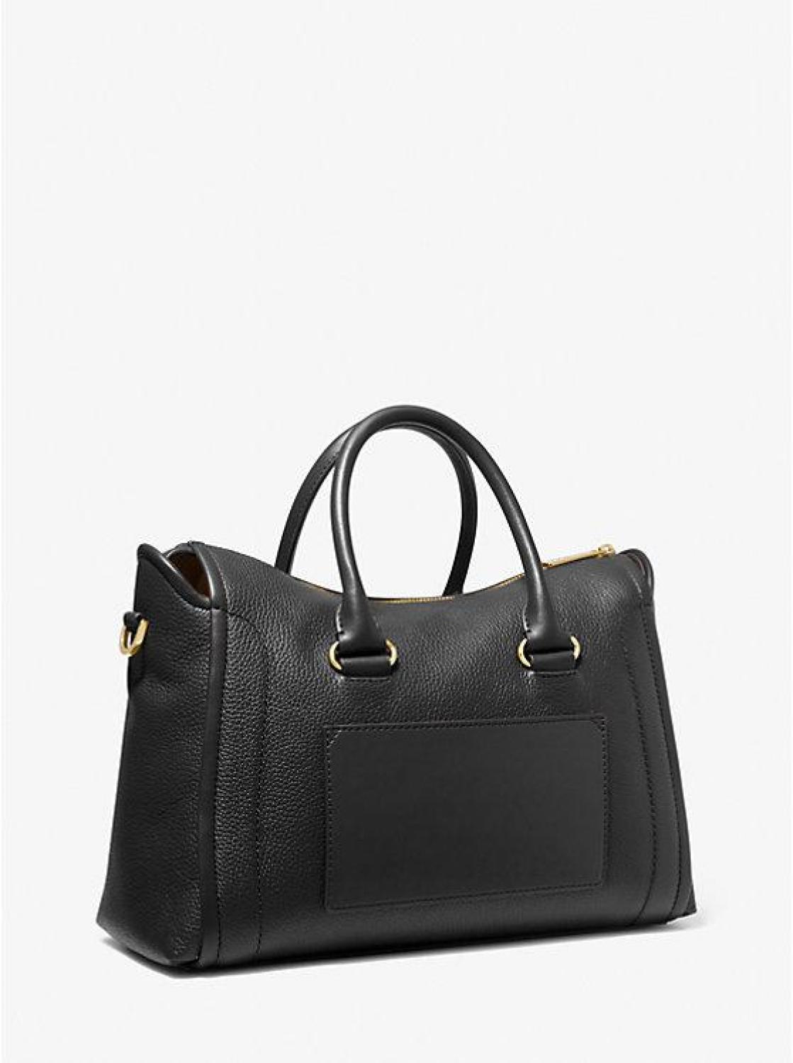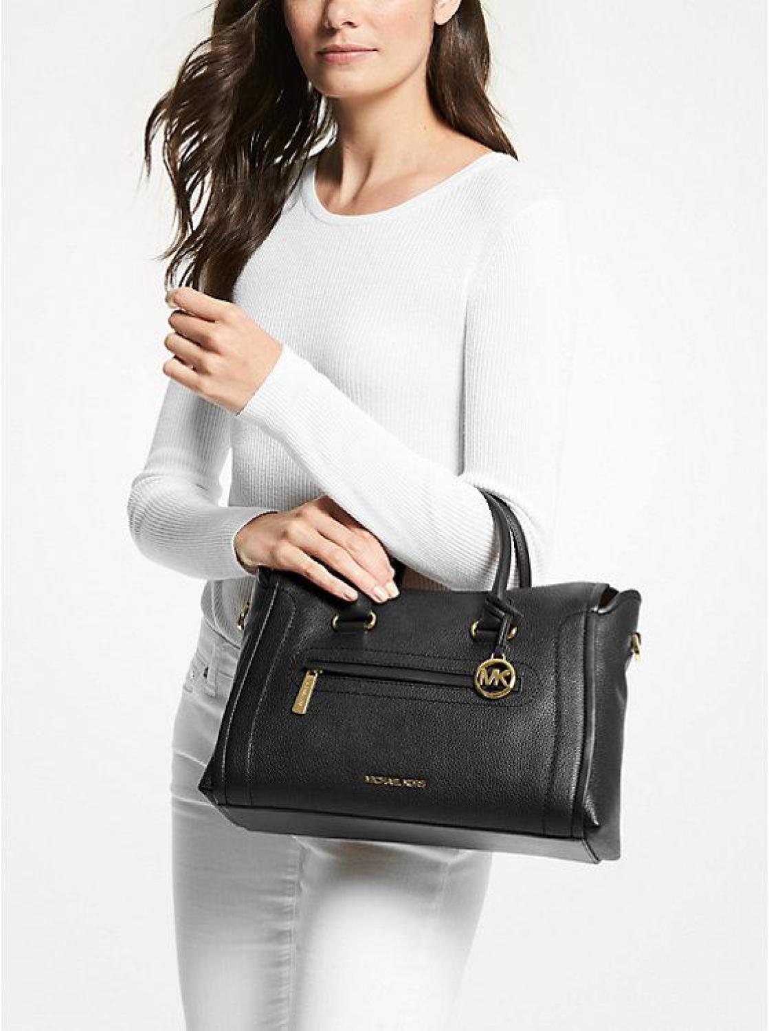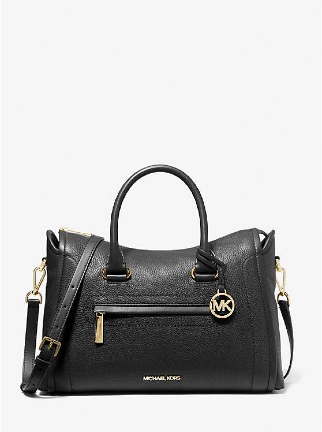 • An instant icon: our sleek Carine satchel will go from day to night with ease, thanks to a generously sized interior with an array of pockets, structured top handles and a removable crossbody strap for varied carrying options. Crafted from pebbled leather with smooth trim, it’s a sophisticated touch to myriad looks. We love how the brand’s iconic “MK” charm lends a polished finish.