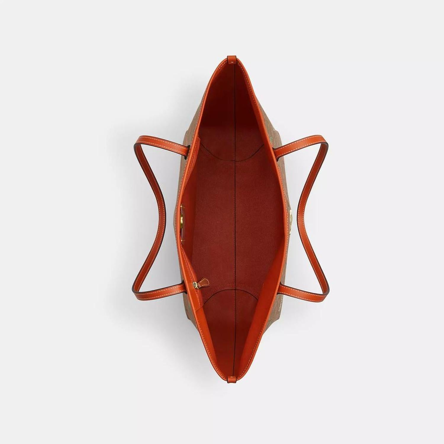 • Signature coated canvas Inside zip pocket Snap closure Handles with 10 drop 13 (L) x 11 1/2 (H) x 6 1/4 (W) Style No. CAL74 | Coach Outlet City Tote Bag In Signature Canvas With Orange Print - Orange