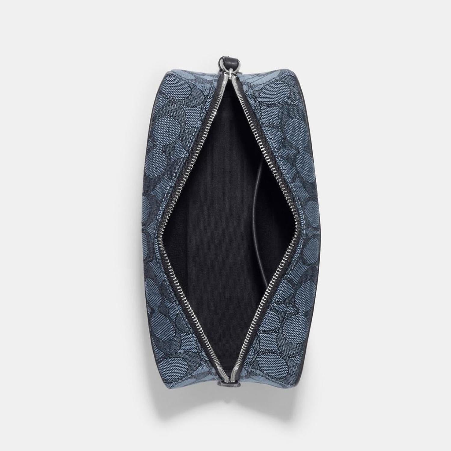 Signature jacquard and refined pebble leather Inside multifunction pocket Zip closure fabric lining Wrist strap attached 7 3/4 (L) x 4 3/4 (H) x 2 3/4 (W) This Coach piece is crafted of our Signature jacquard made from a blend of organic cotton and recycled polyester Style No. C9119 | Coach Outlet Dempsey Boxy Cosmetic Case 20 In Signature Jacquard With Stripe And Coach Patch - Multi