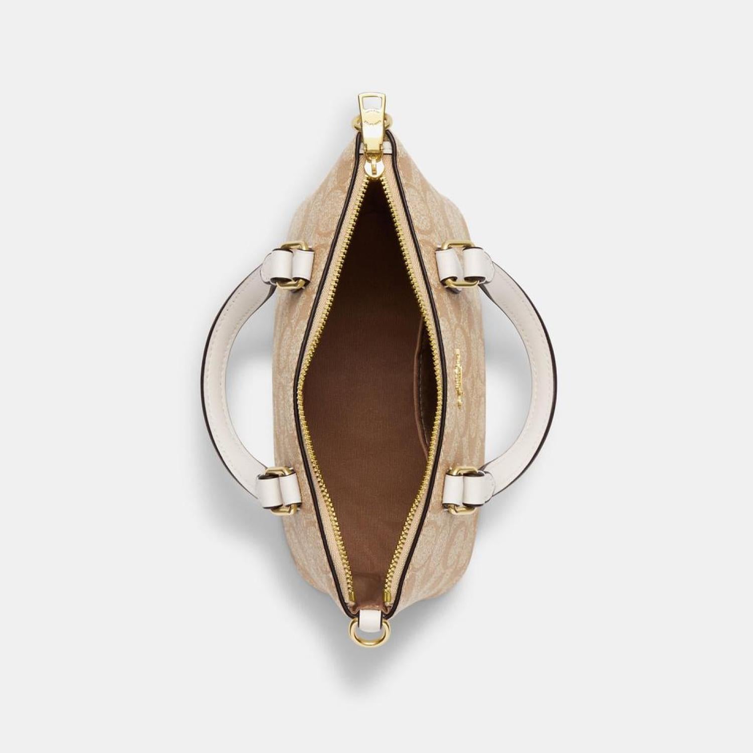 Signature coated canvas and smooth leather Two credit card slots Zip-top closure fabric lining Handles with 3 drop Detachable strap with 23 1/2 drop for shoulder or crossbody wear 7 1/4 (L) x 5 (H) x 3 1/2 (W) Style No. CH468 | Coach Outlet Mini Gallery Crossbody In Signature Canvas - Beige