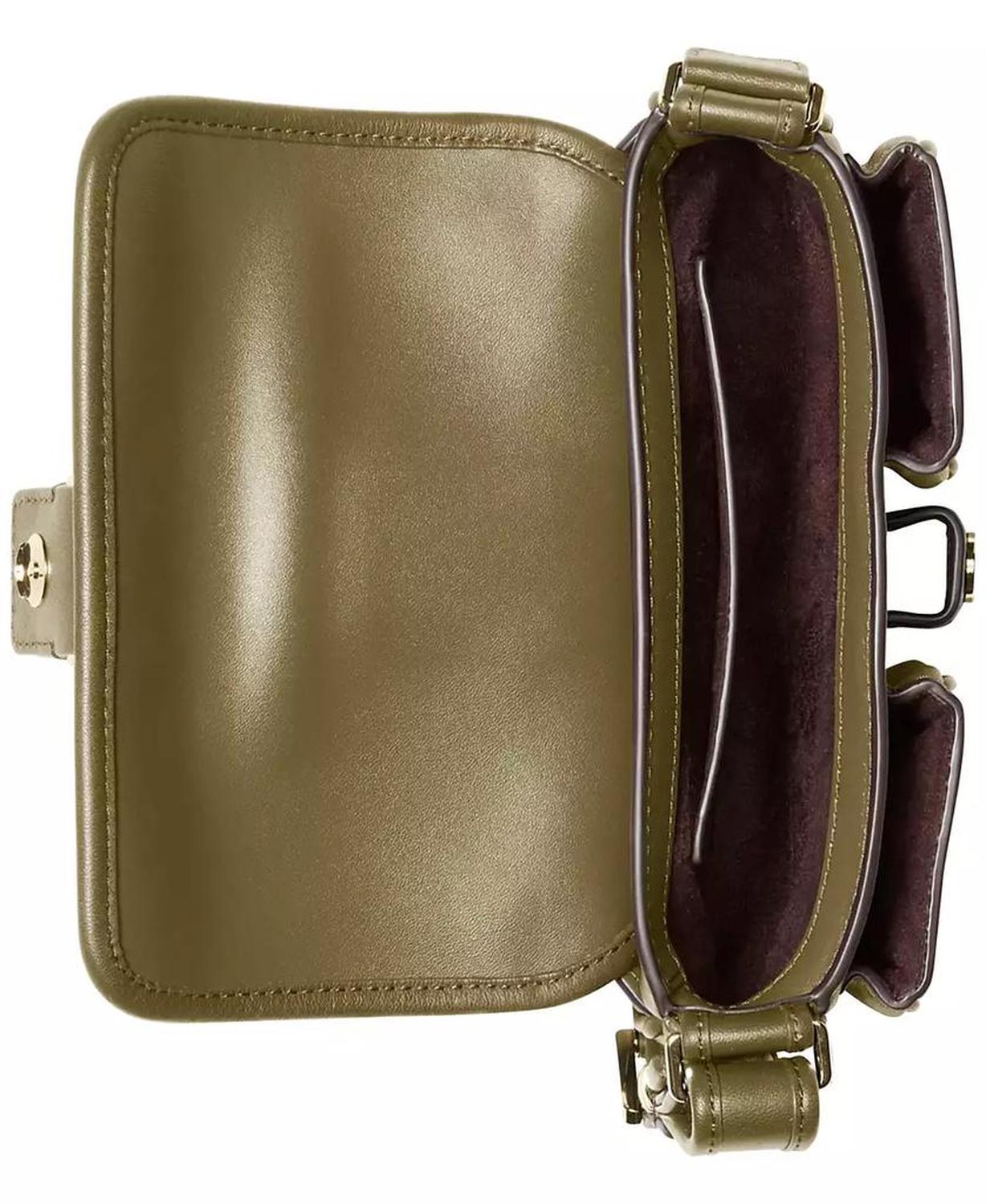 Gold-tone hardware & decorative buckle with logo, exterior back slip pocket, 2 front slip pockets under flap, interior slip pocket