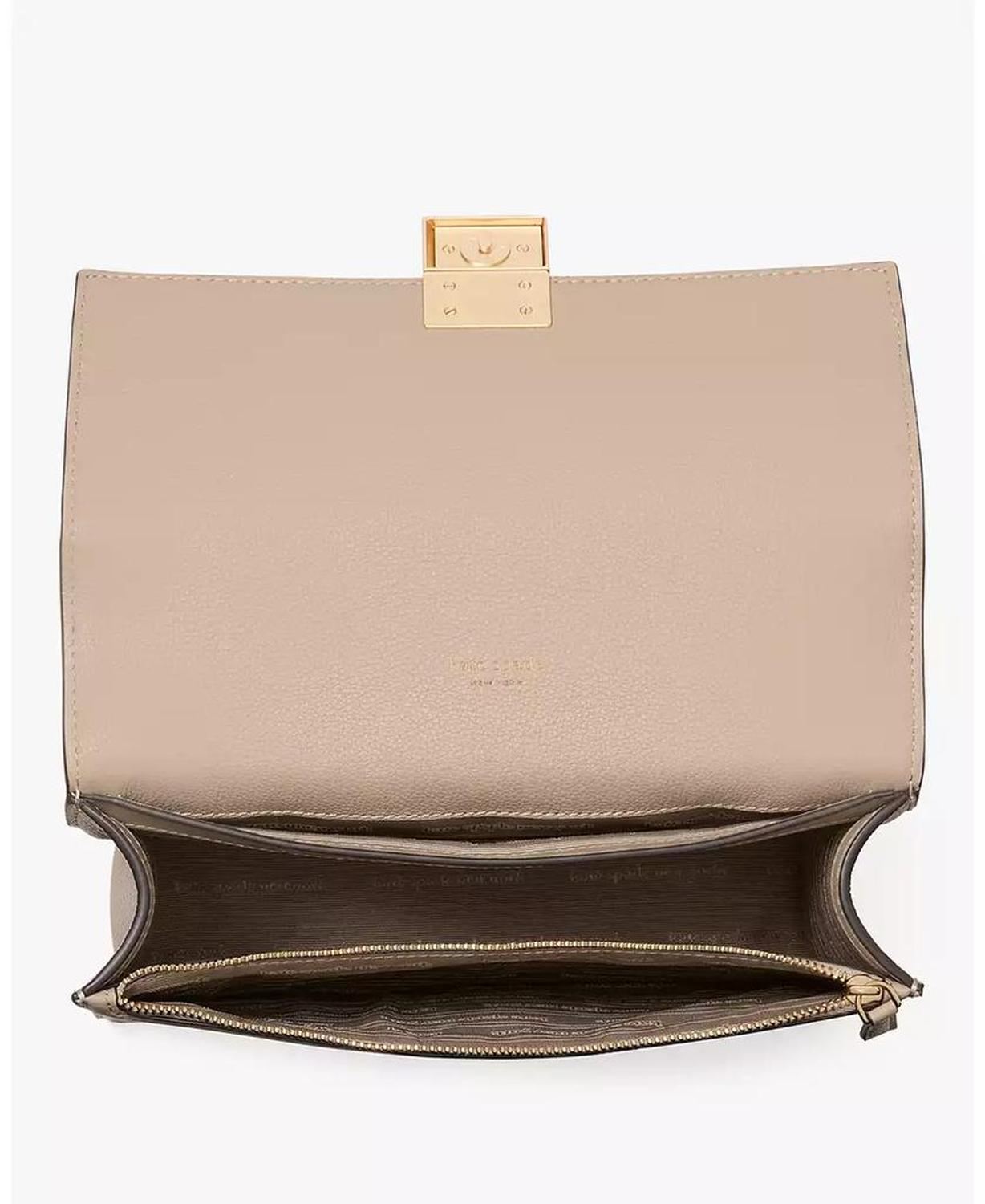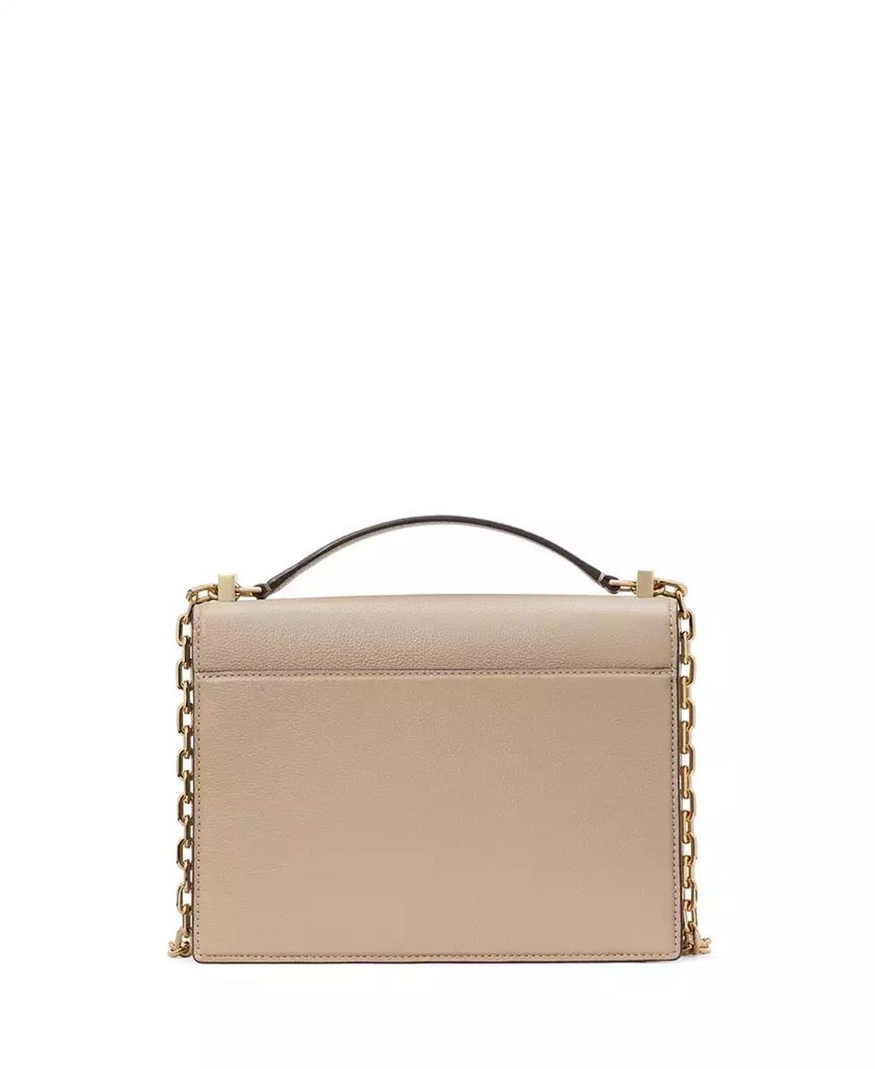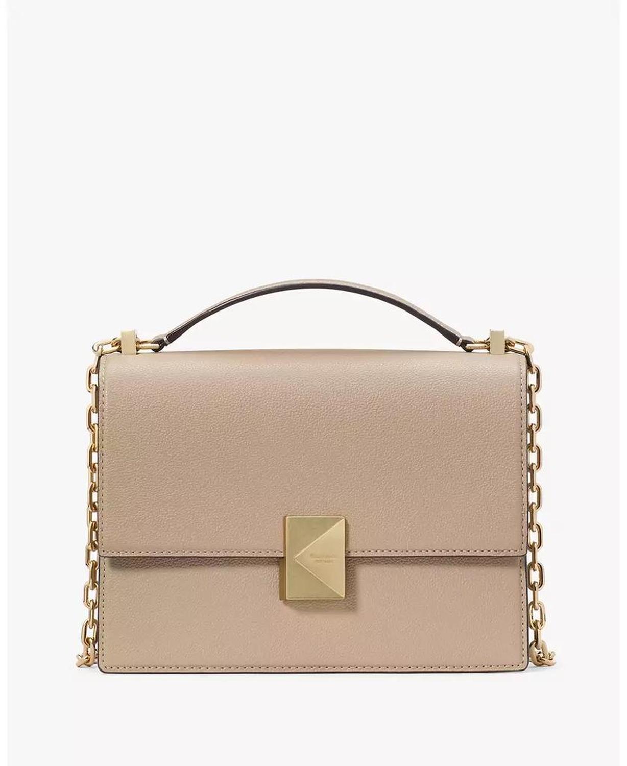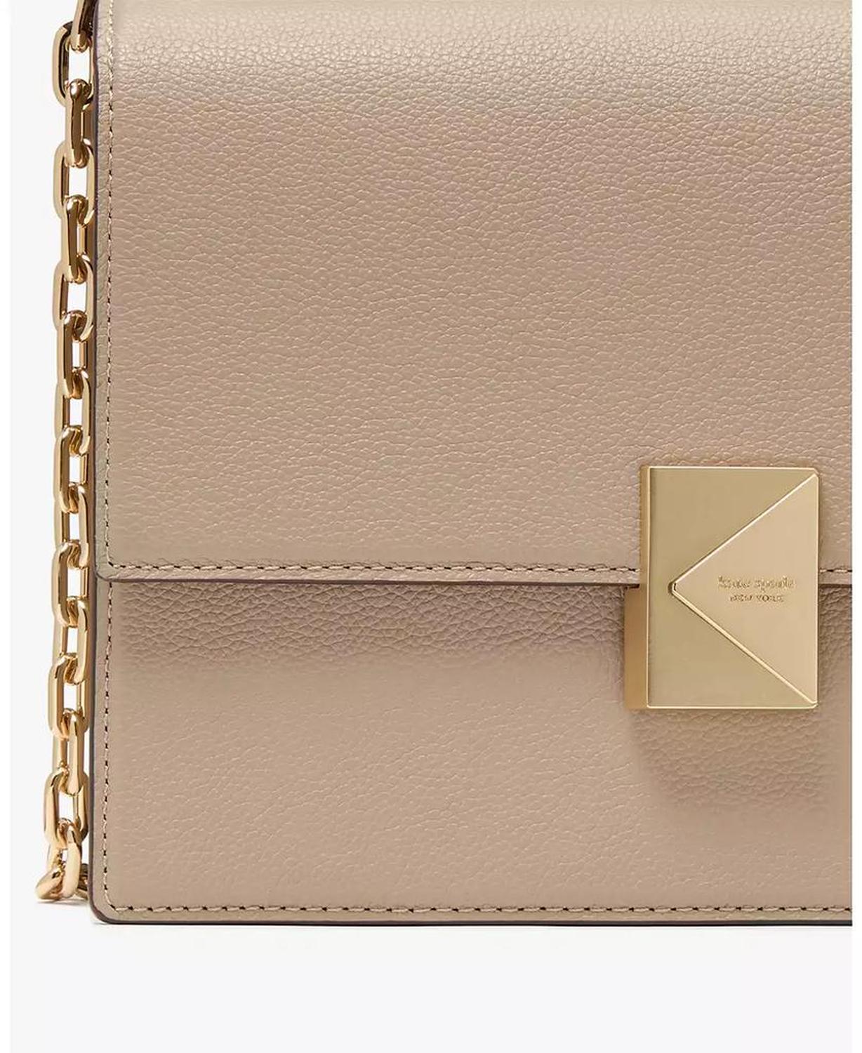 This sleek shoulder bag by kate spade new york is made of pebbled leather with gold-tone hardware inspired by Art Deco style. Small sized bag; 9-1/10"W x 7-2/3"H x 2-7/10"D (width is measured across the bottom of handbag); 1 lb. approx. weight Silhouette is based on 5'9" model Grab handle; 22"L chain strap Magnetic snap closure Gold-tone exterior hardware; interior zip pocket & slip pocket Dust bag included Fits phone 100% leather Spot clean Imported