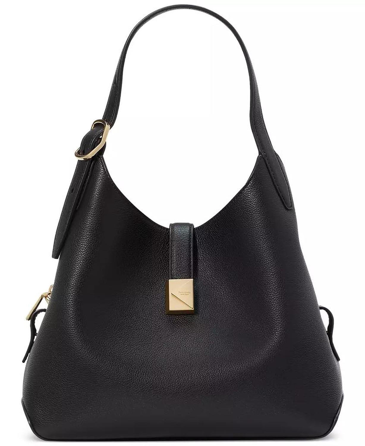 Fashionably tote all your essentials with this medium-sized bag from Kate Spade New York. Medium-sized bag; 8-1/5"W x 11"H x 5-3/5"D (width is measured across the bottom of handbag); 1.00 lb. approx. weight Silhouette is based on 5'9" model 5"L double adjustable handles; 22"L removable adjustable strap Magnetic snap closure Gold-tone hardware, slip pocket, center zip compartment Fits iPhone Max, zip around continental wallet Leather Spot clean Imported