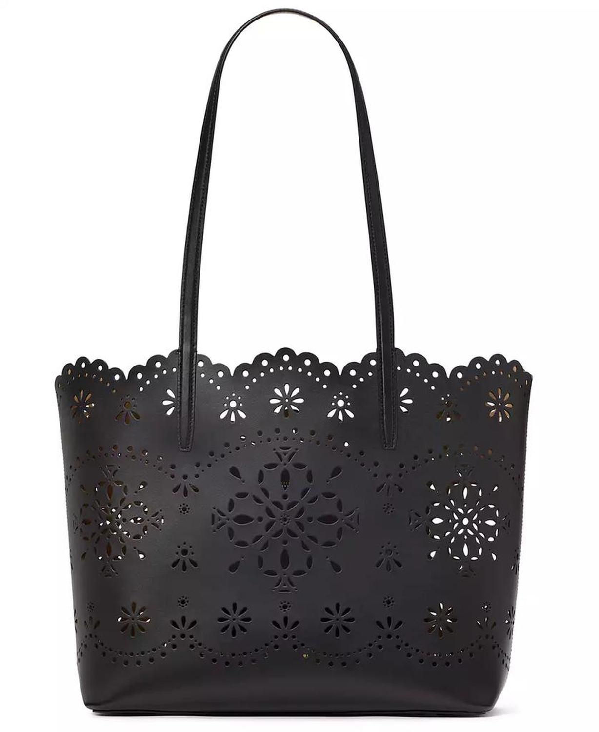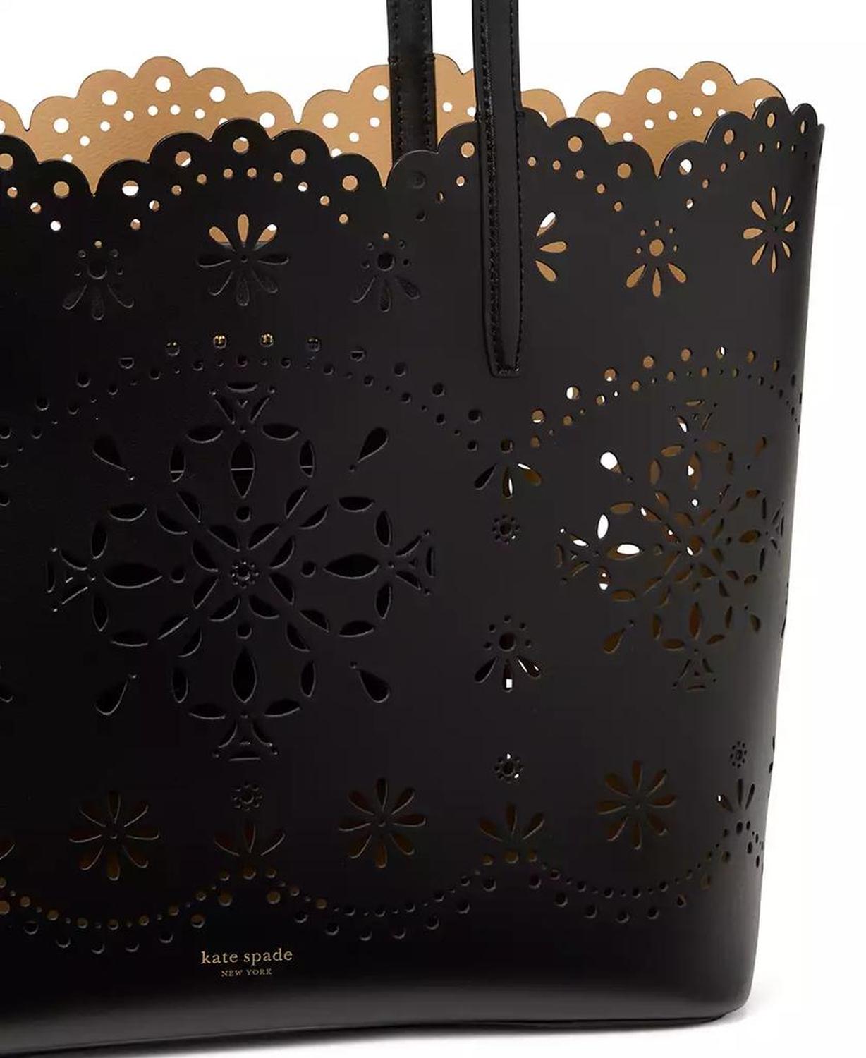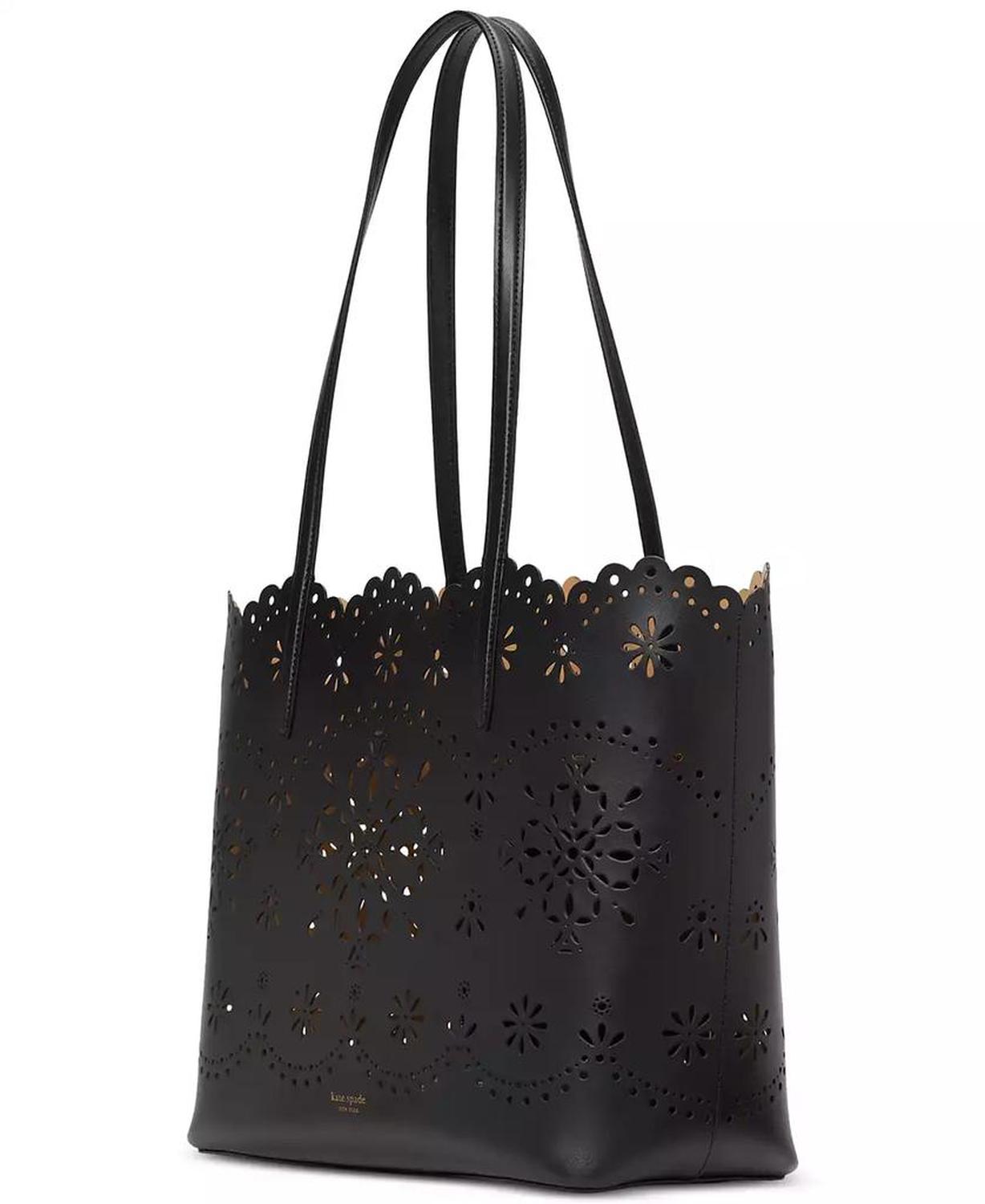 • No matter what your day brings, kate spade new york's tote is up for it all. Made from leather featuring an intricate Spade Flower perforation, this carryall fits all your necessities and includes multiple storage pockets.