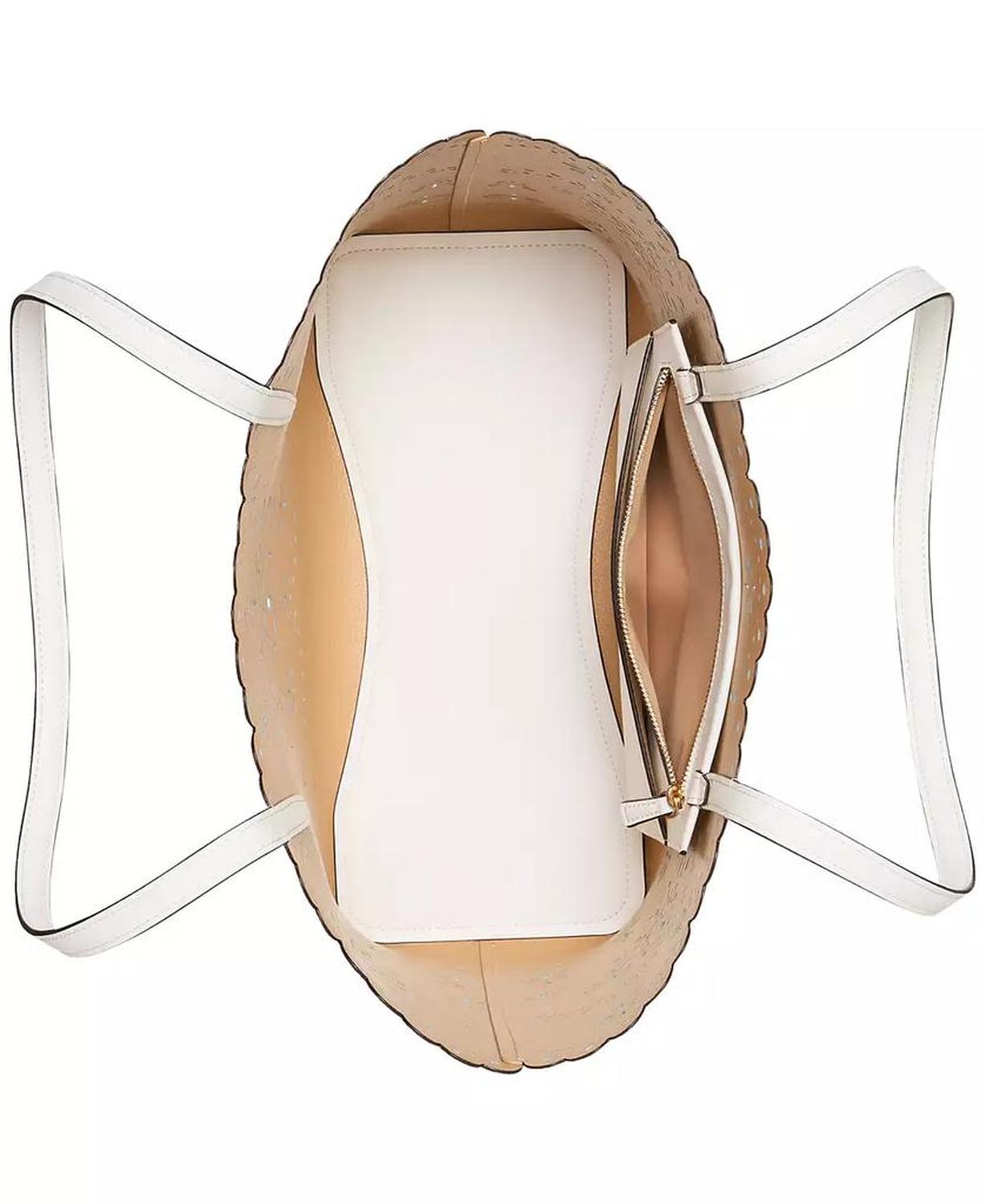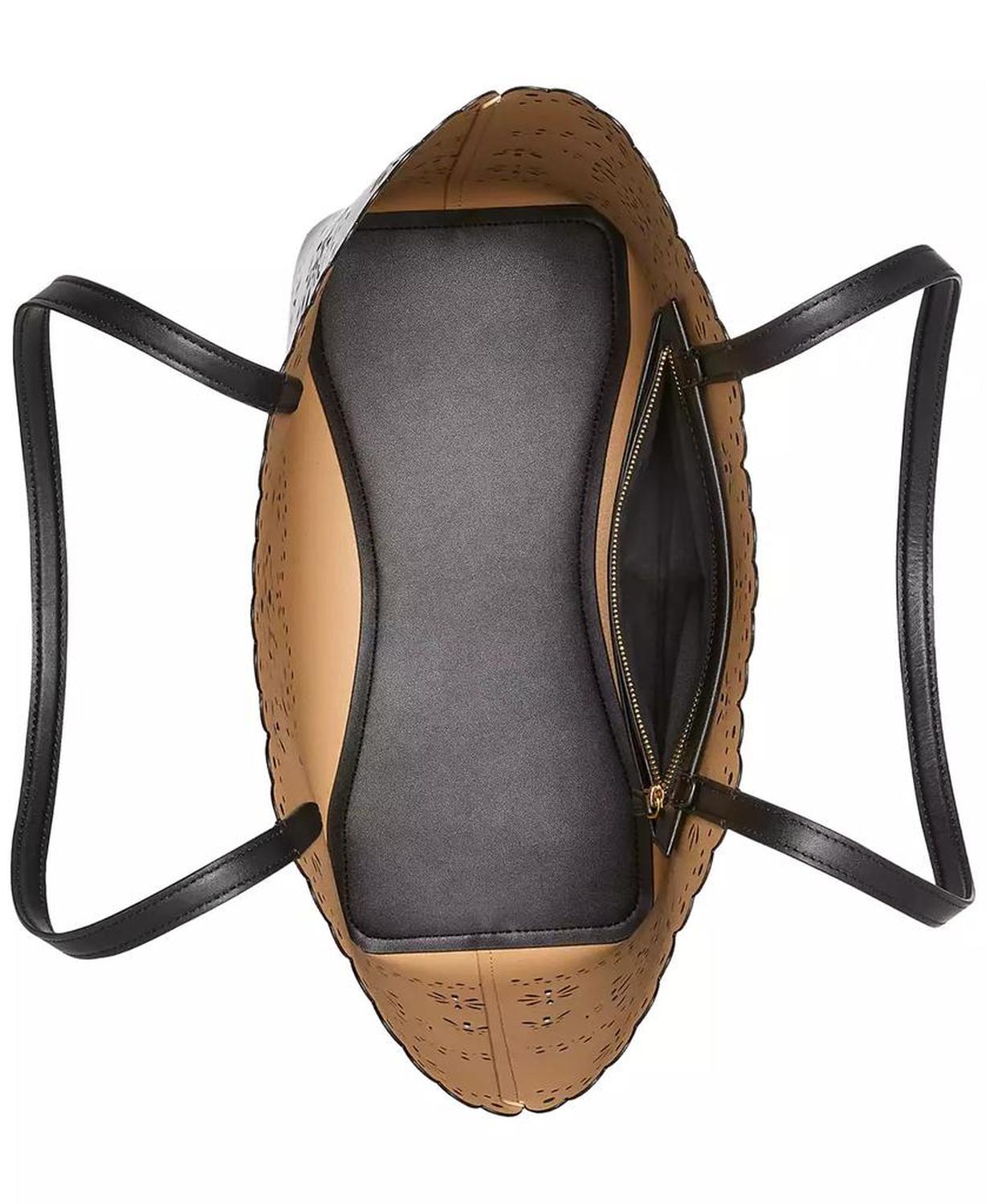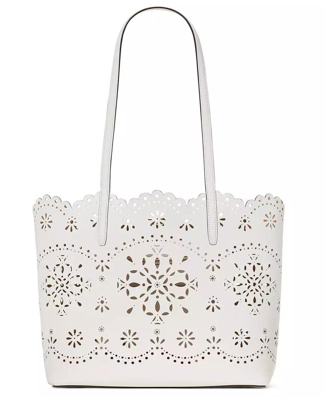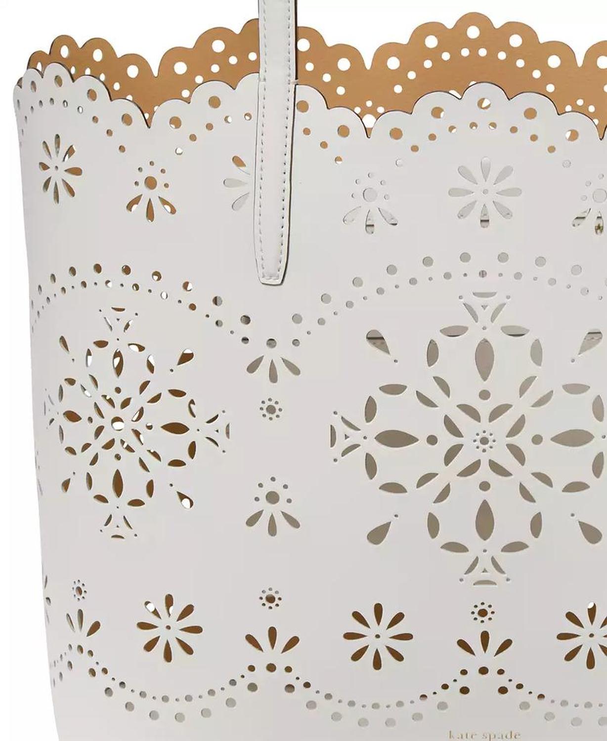 • No matter what your day brings, kate spade new york's tote is up for it all. Made from leather featuring an intricate Spade Flower perforation, this carryall fits all your necessities and includes multiple storage pockets.