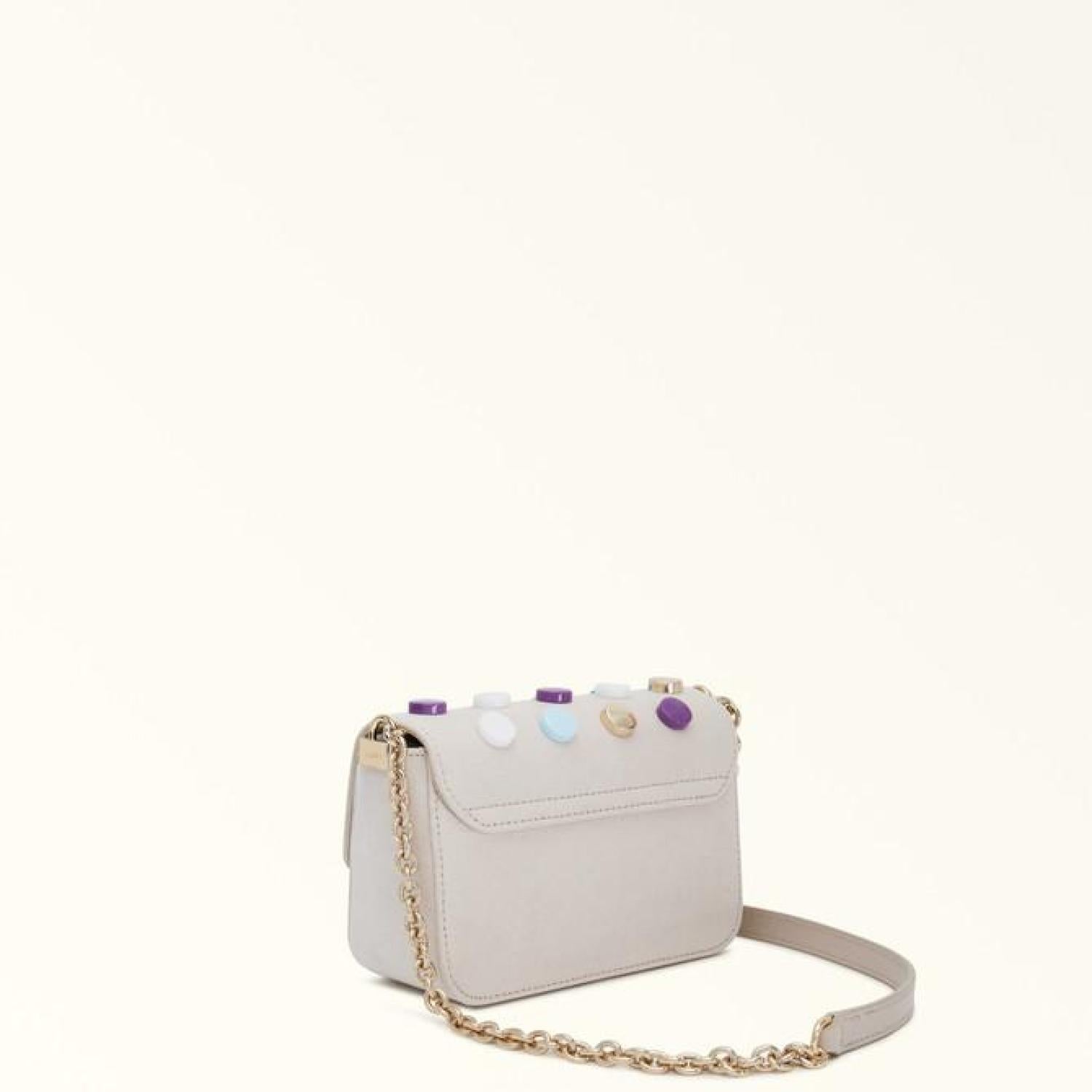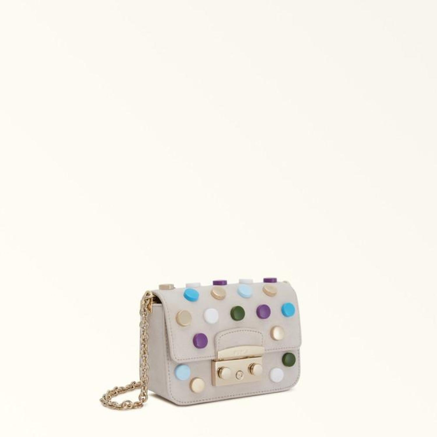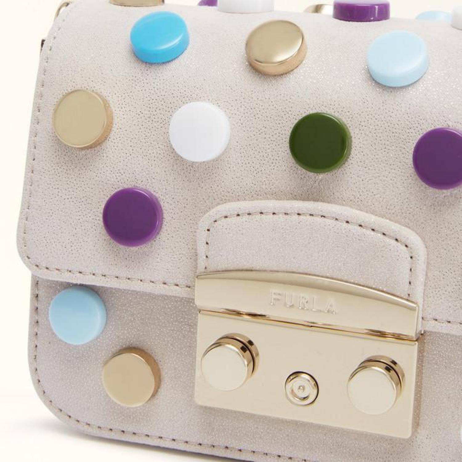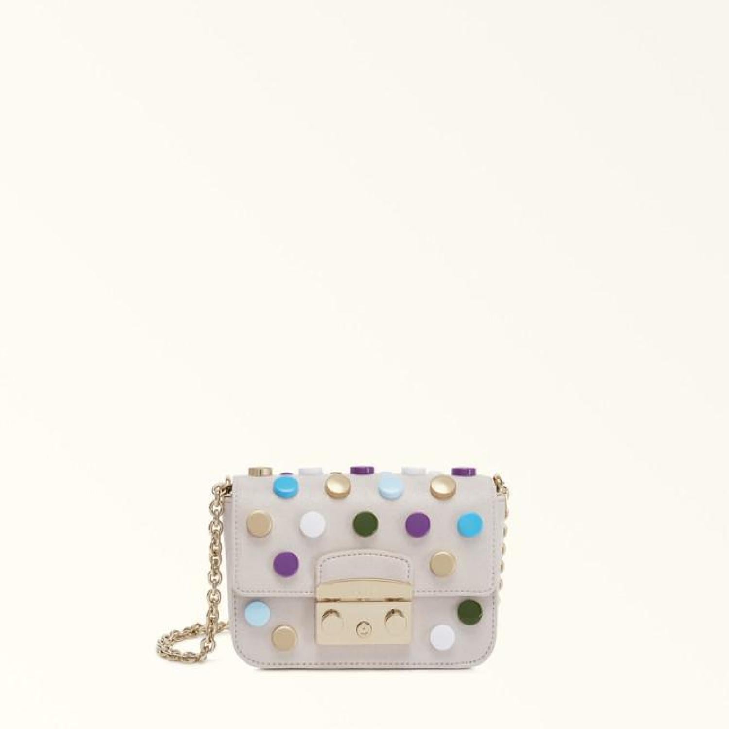 • Crafted from super-soft suede, this iconic Furla Metropolis mini crossbody is covered with multicoloured round studs for a contemporary feel. Steal all the attention in the room, whether you wear it over your shoulder, or tuck the slim chain inside to carry it as a clutch.