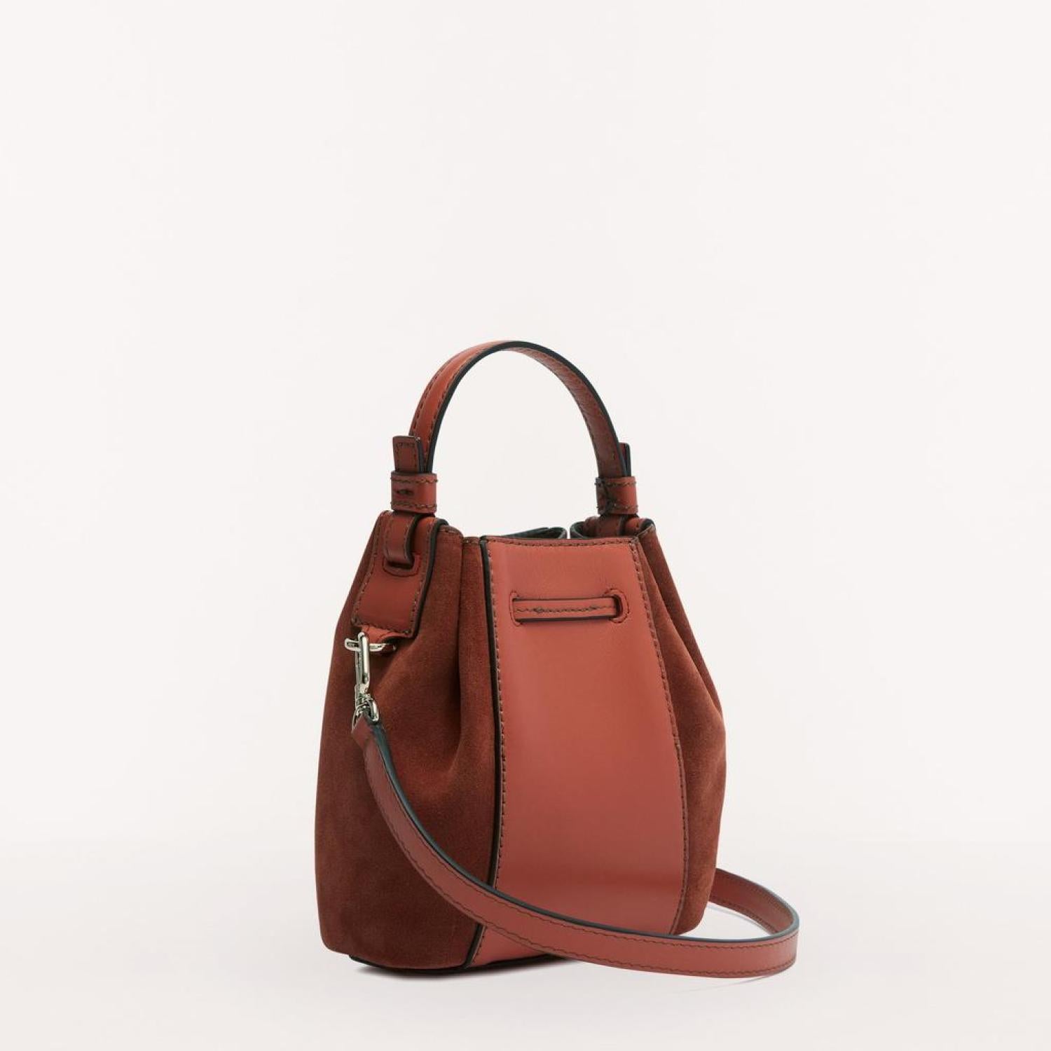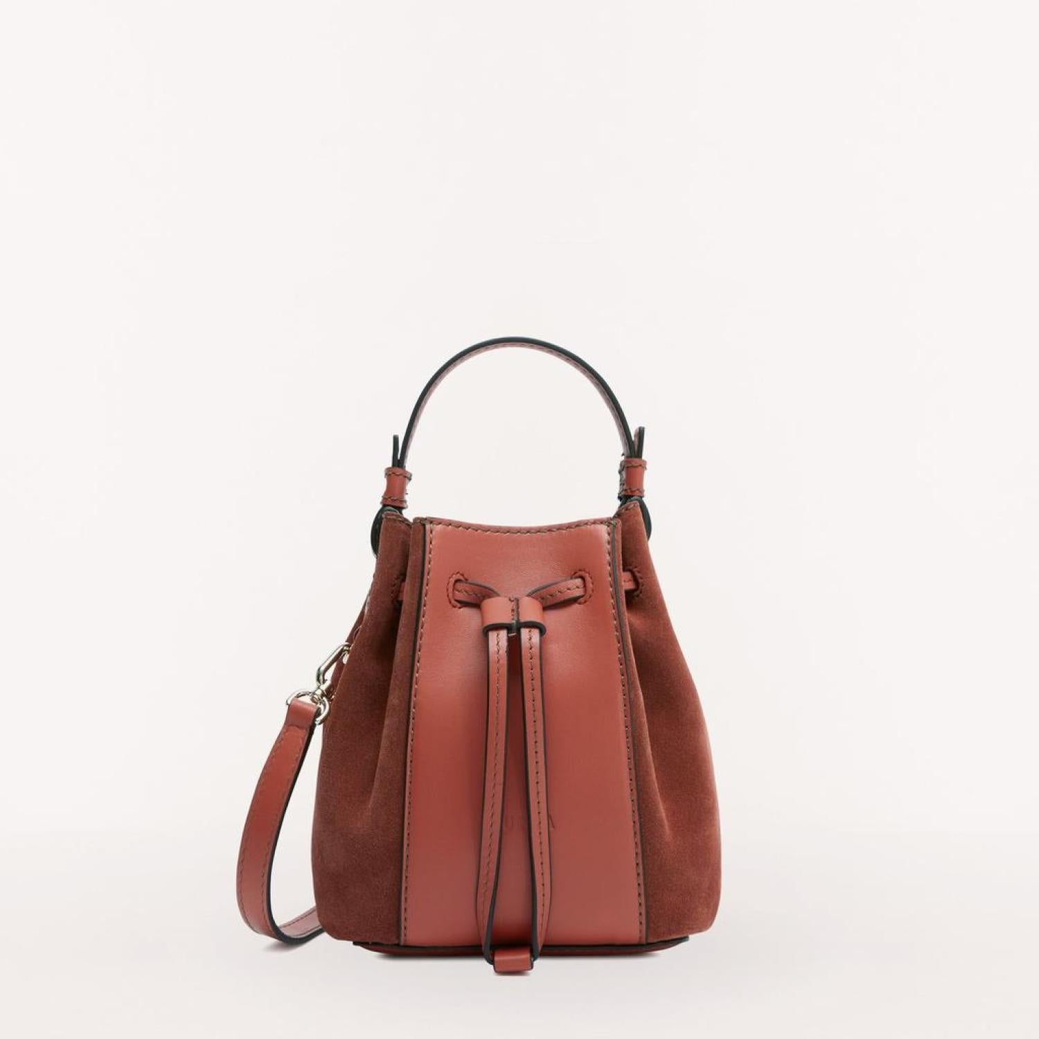 • Furla Miastella is a micro bucket bag made in a combination of soft Roma calfskin and suede. With an adjustable and removable strap, the accessory can be worn two ways, either as a handbag or as a crossbody bag. Perfect for everyday use, its compact size allows you to neatly store your smartphone and personal belongings. - Top handle- Drawstring closure- Inside pocket- Furla logo engraved on the front- Galvanised light gold finishes Dimensions 6.3 x 7.09 x 3.54 (w x h x d)