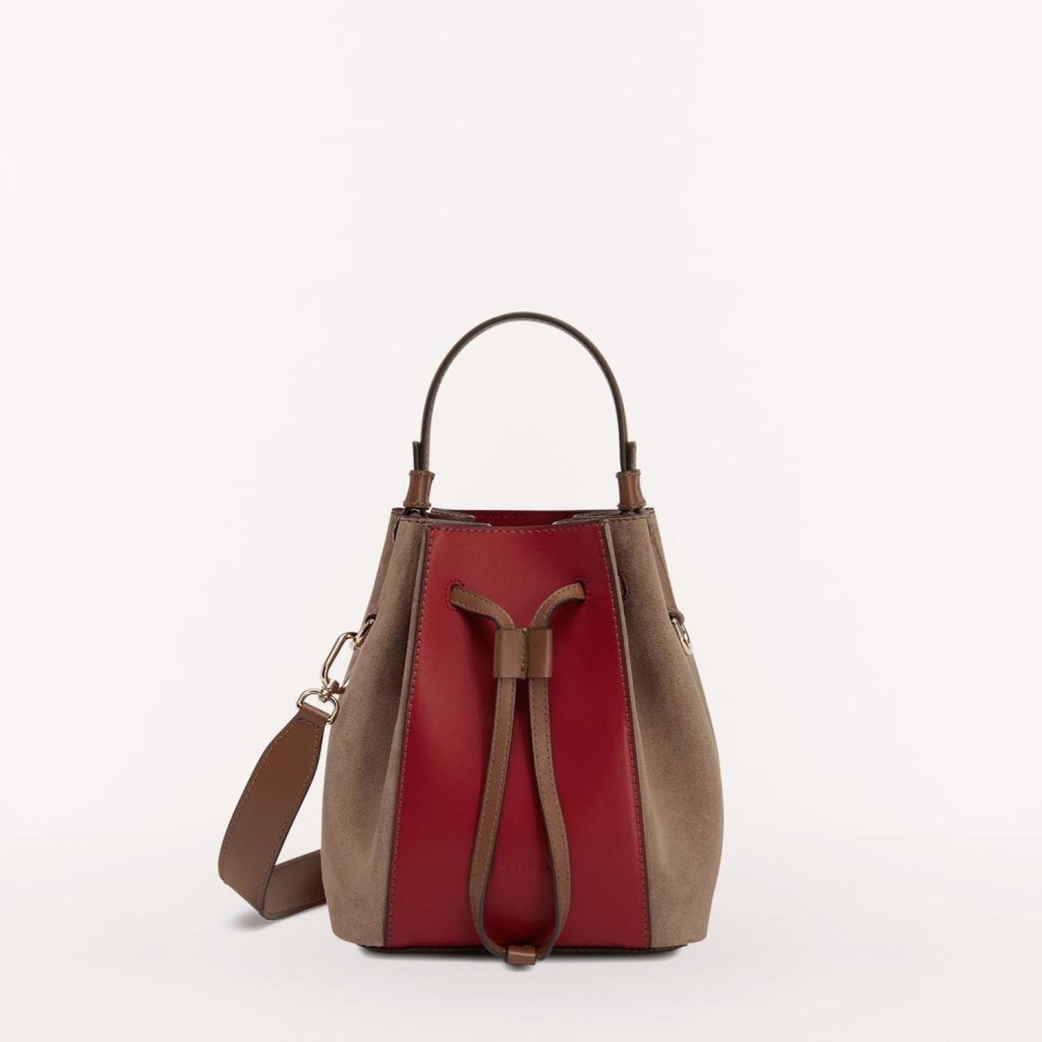 Furla Miastella is a mini bucket bag made in a combination of soft colour-block Roma calfskin and suede. The model has a top handle and an adjustable, removable leather strap and can be worn daily as a handbag, a shoulder bag or a crossbody bag. The accessory is completed with a drawstring closure to store your personal belongings, smartphone and small items. - Inside pocket- Inner leather tag with Arch logo- Galvanised light gold finishes Dimensions 7.48 x 8.86 x 4.33 (w x h x d)