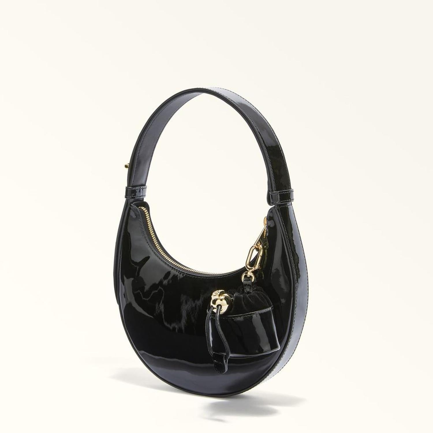 The Furla Mionido AirPods case is a micro bucket bag made of glossy patent leather. Elevated by a soft velvet satin trim around the top, it features a drawstring closure with a Sfera stopper and a button decorated with the iconic Arch logo. Equipped with a snap hook, you can attach it to your belt loops or trousers, the handles or straps of your favourite bags.