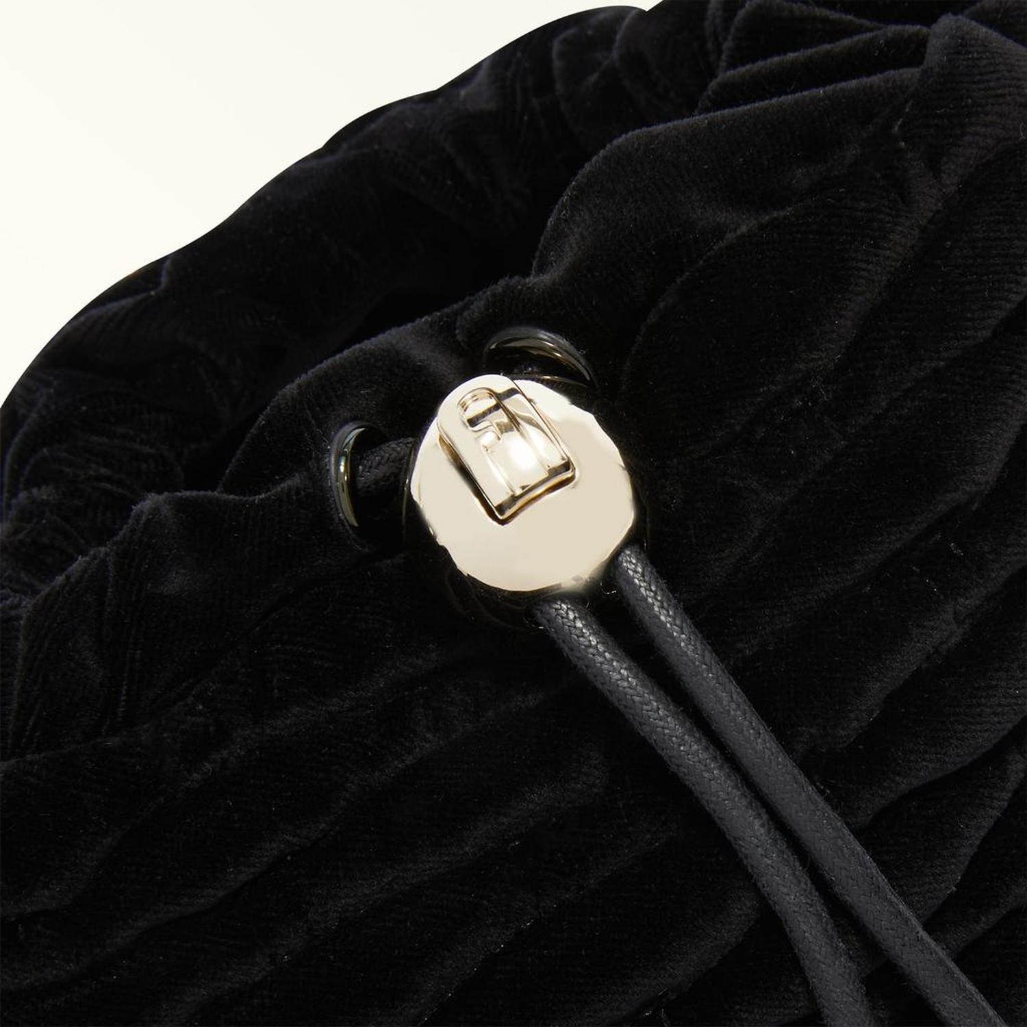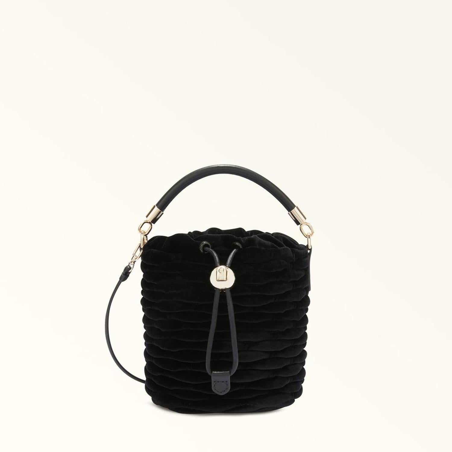 • This elegant Furla Mionido mini crossbody is distinctive with its quilted velvet fabric reminiscent of artisan willow weaving. The soft structure and relaxed silhouette of this bucket-bag inspired piece are complemented by the detachable leather shoulder strap and matching top handle, meaning it can be carried by hand, worn crossbody or on the shoulder.