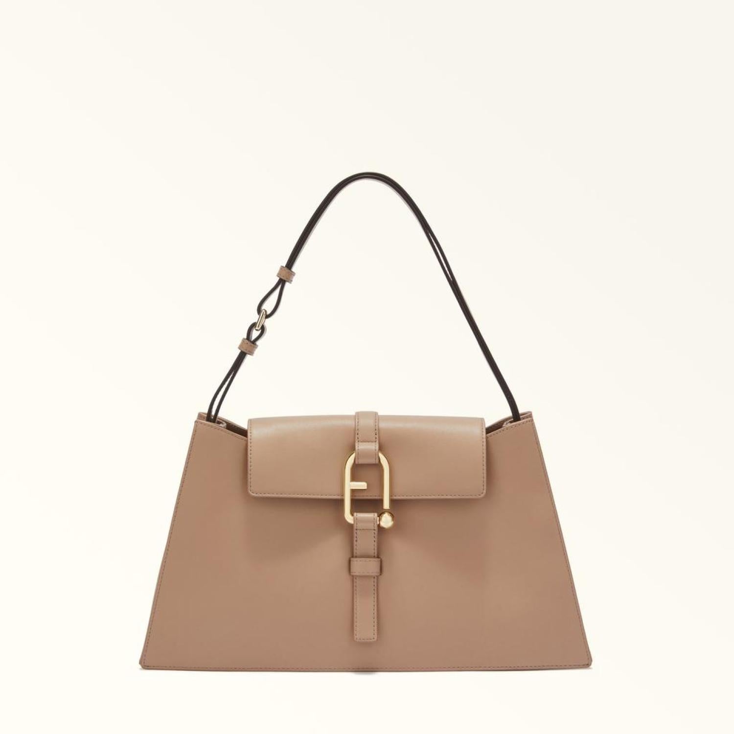 • This spacious and roomy piece boasts geometric lines that make a real style statement, crafted in luxurious leather. The Furla Nuvola shoulder bag is designed to hold everything you might need throughout the day, and for an elegant touch, it is finished with a flap closure embellished with the new interpretation of Arcosfera hardware, which brings the iconic Furla Arch logo together with the original round element of the brand.