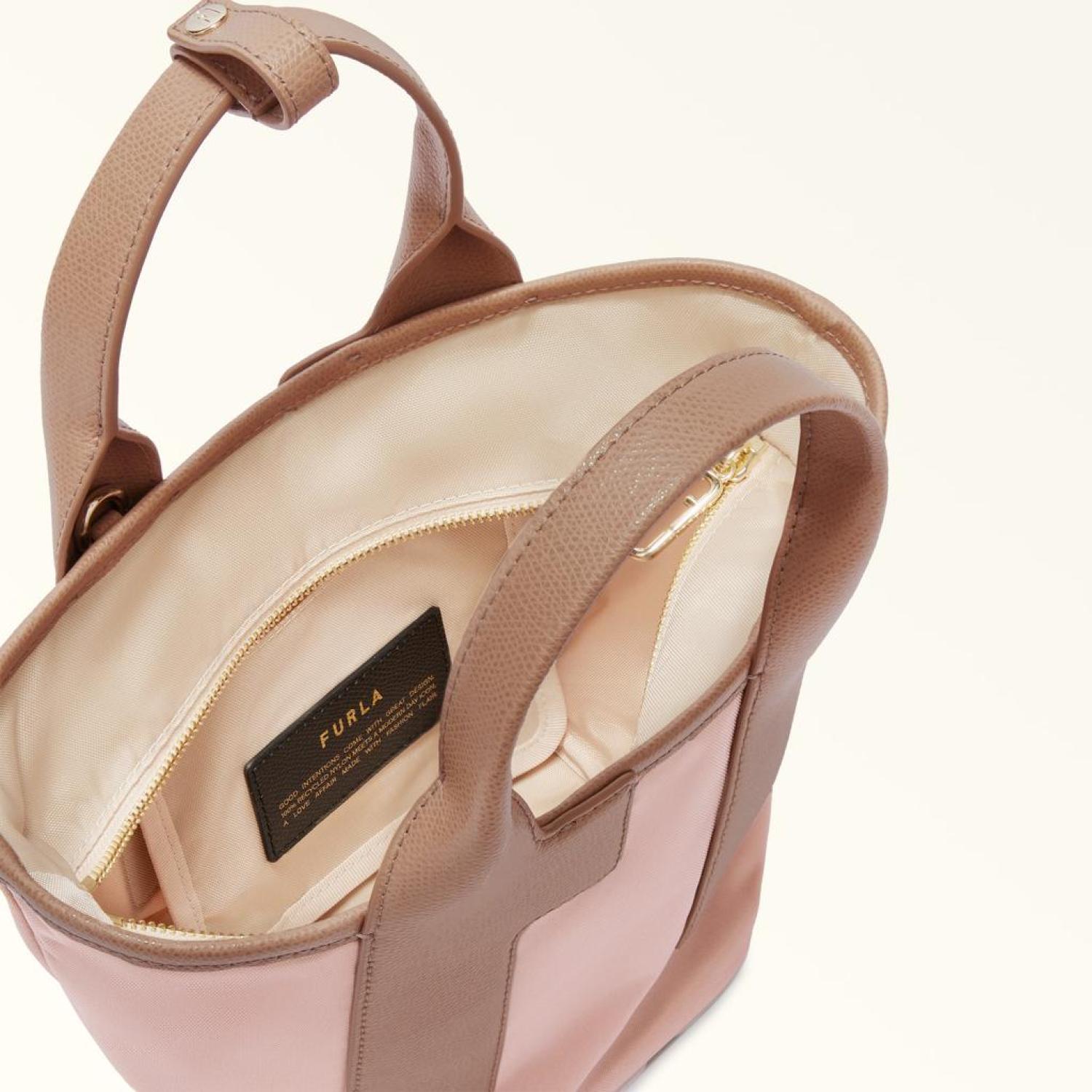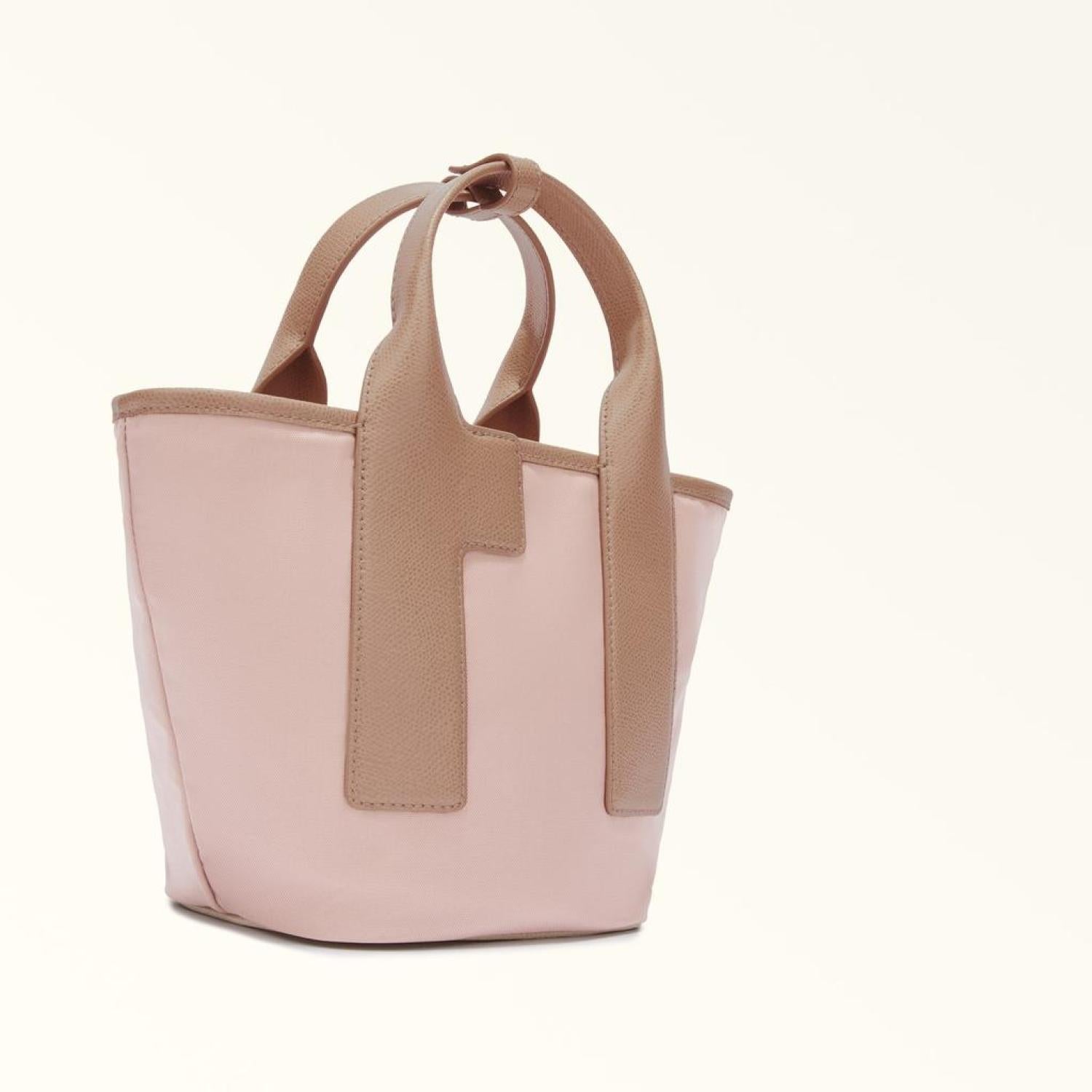 • With plenty of space for all your essentials, the small Furla Piuma tote bag is the epitome of versatility. Made of recycled nylon, its printed leather handles – in the shape of the brand's iconic Arch logo – create an elegant colour-block effect. Secured to your suitcase with its press-stud tab, this cosmopolitan hand or shoulder bag turns into a trusty travel companion.