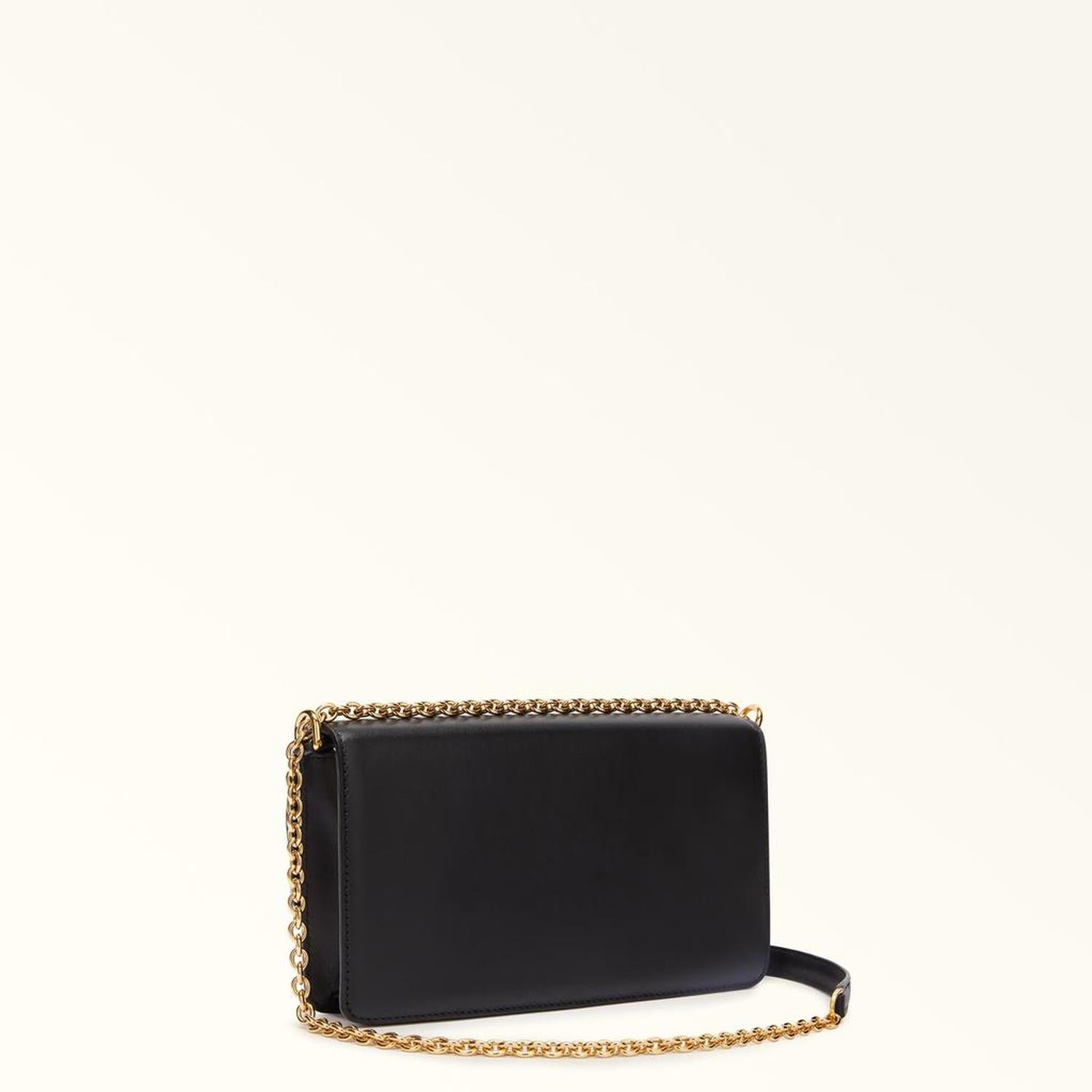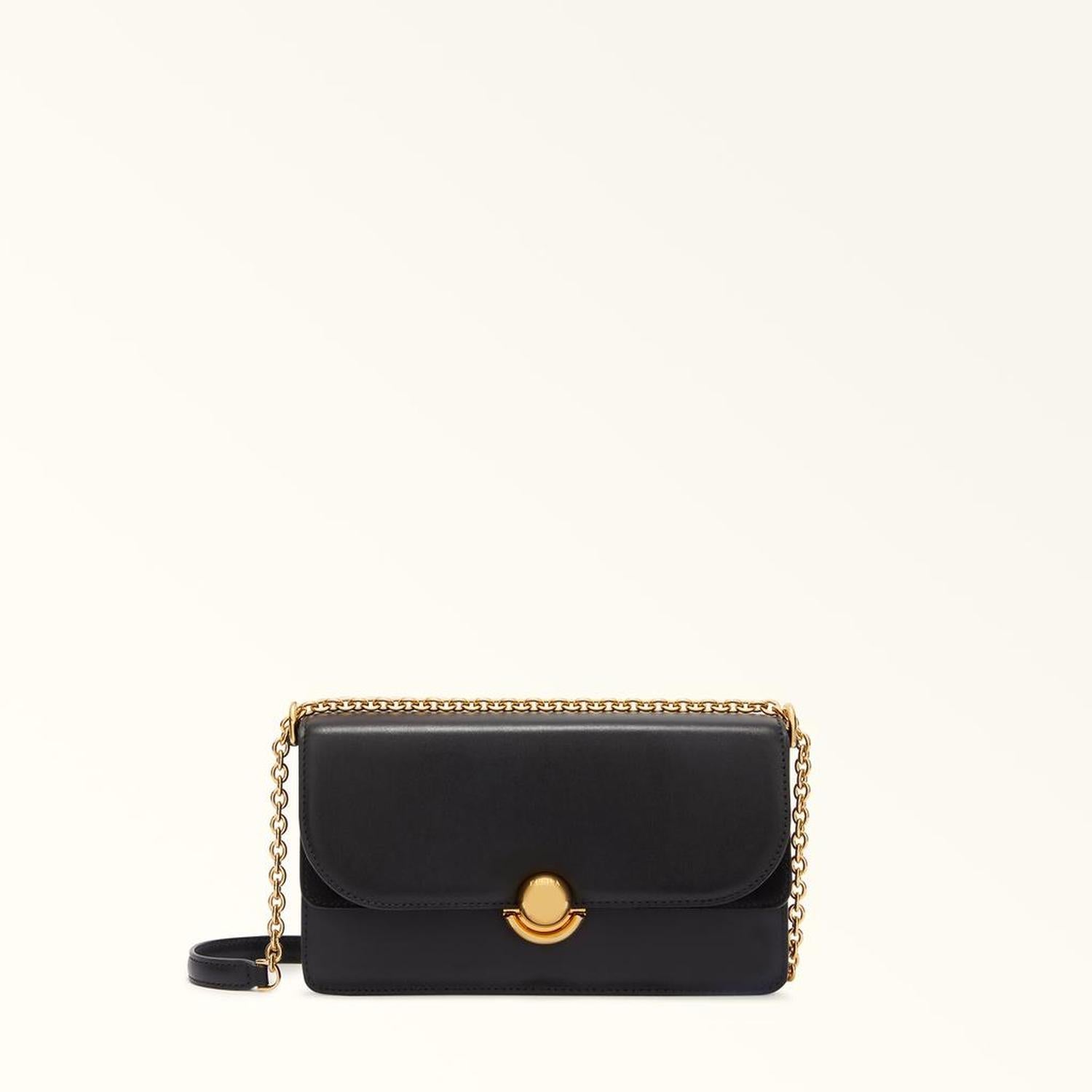 • This small Furla Sfera crossbody features a long chain shoulder strap with a leather insert for comfortable wear. Styled in smooth leather with a baguette silhouette, the inner flap is embellished with soft suede, while the outside of this compact piece is adorned with shiny Sfera hardware on the elegant bold closure.