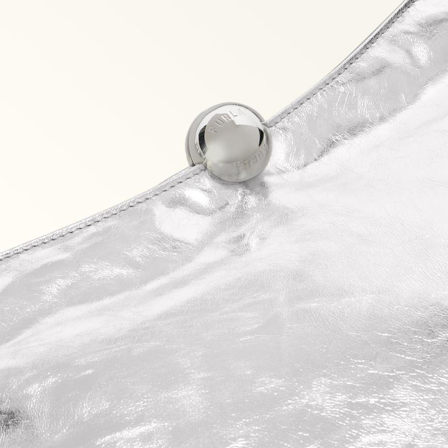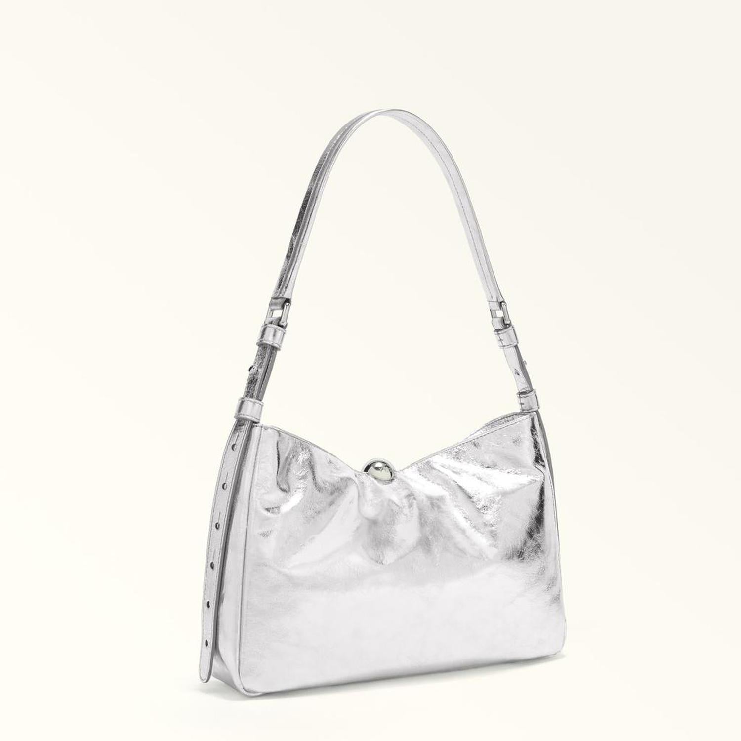 Furla Sfera Soft offers clean lines and a minimal silhouette. The shoulder bag's contemporary design is elevated by soft metallic nappa, its crackle finish creating a dazzling ripple effect. Its shape follows the hollow of your arm, sitting comfortable over the shoulder. Sfera hardware with a magnetic button adds a touch of elegant originality. - Open inside pocket - Inside zip pocket - Adjustable leather handle - Metal feet