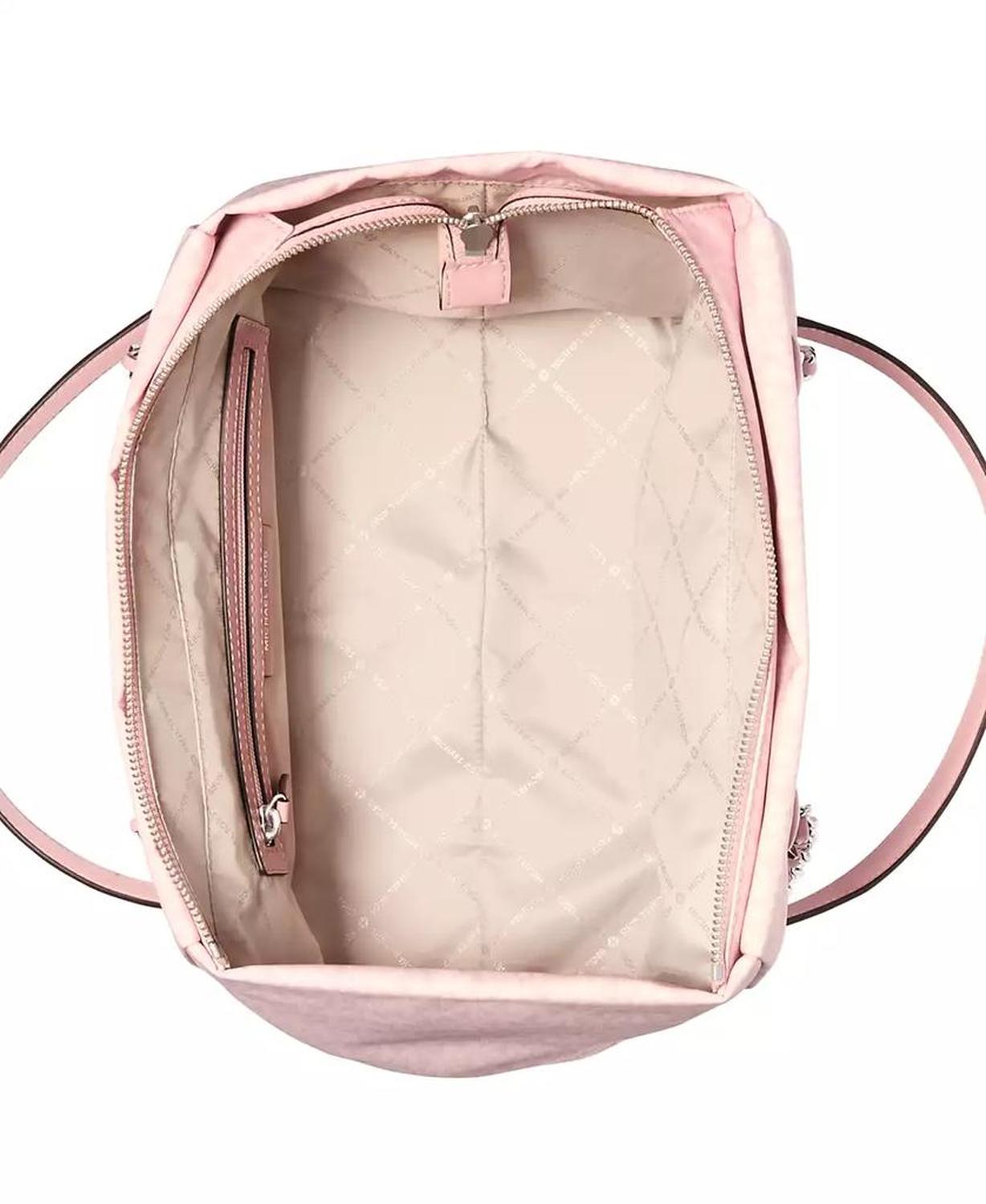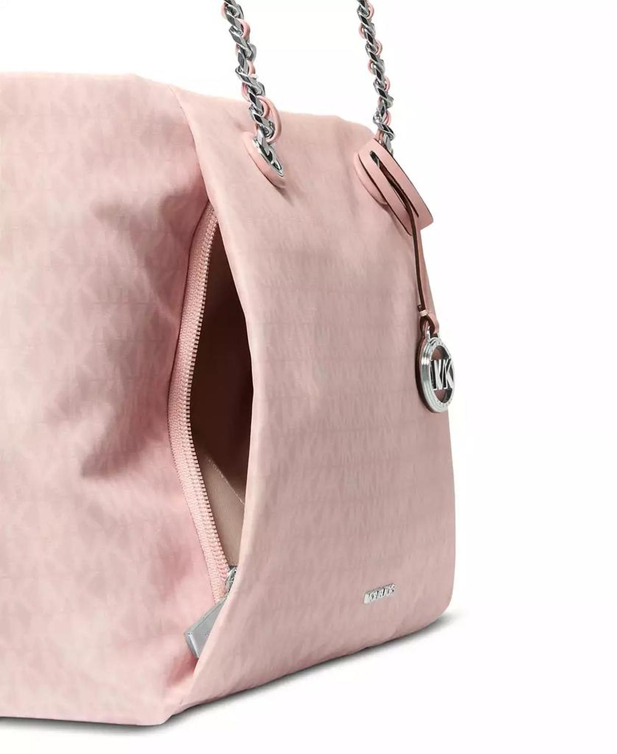An allover logo print shows off your love for the MICHAEL Michael Kors brand on this must-have small Georgia tote bag. Small-sized bag; 16-3/4"W x 9-1/4"H x 5-1/4"D (width is measured across the bottom of handbag); 1.07 lb. approx. weight Silhouette is based on 5'9" model 11"L double straps Zip top closure Logo charm at strap, allover logo print, 2 exterior zip pockets 1 interior zip pocket Polyester; lining: polyester; trim 1: 75% polyurethane, 25% polyester; trim 2: 60% polyurethane, 20% cotton, 20% polyester Spot clean Imported