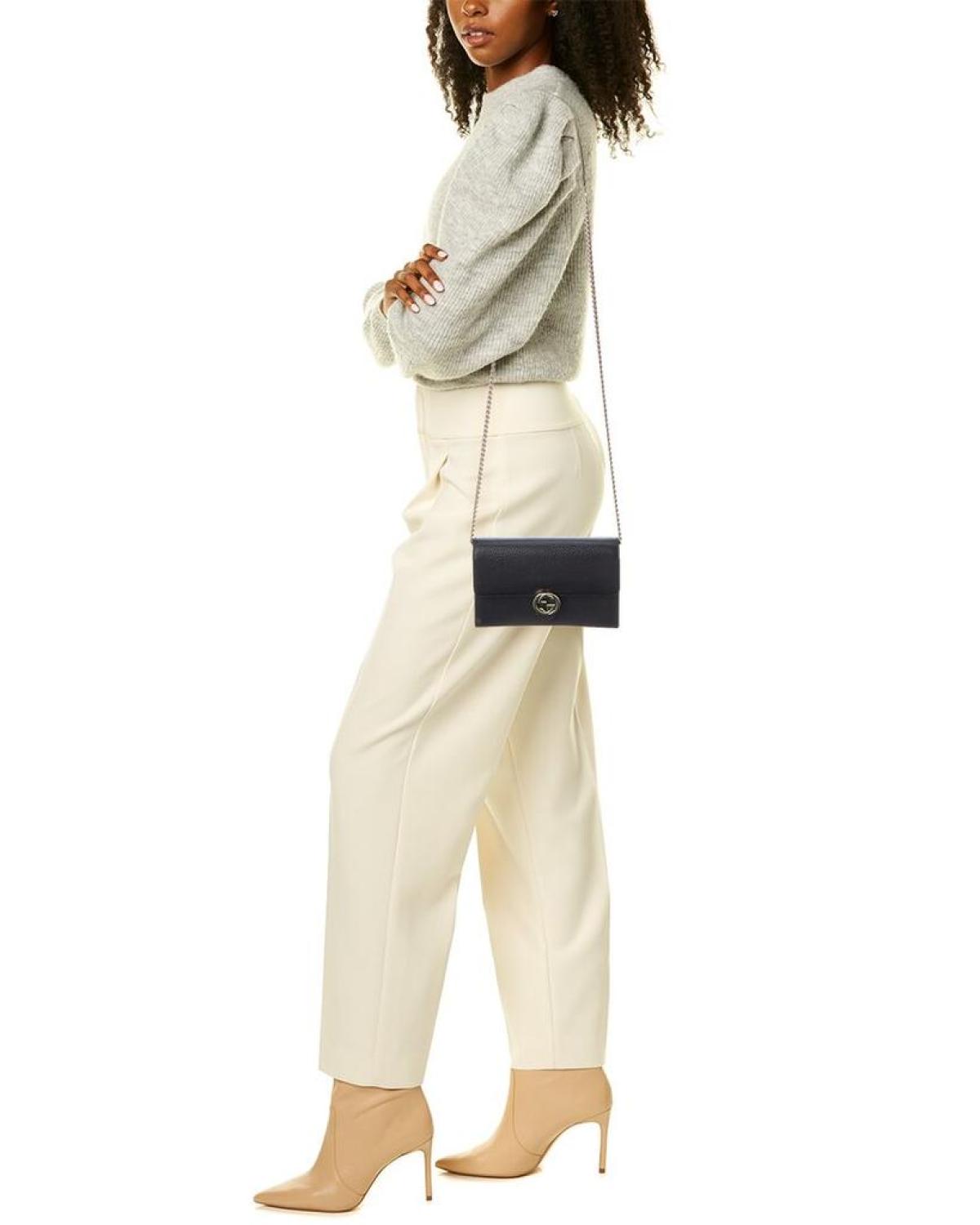 Looking for a chic and sophisticated wallet that will elevate any outfit? Look no further than Gucci's Interlocking G Leather Wallet On Chain, the ultimate accessory for the modern woman. Crafted from high-quality black leather and adorned with light fine gold hardware, this wallet features the iconic interlocking G logo, a symbol of Italian luxury and style. The interior is lined with supple leather and boasts ample space for all your essentials, including a zippered pocket and card slots. With a removable shoulder strap that drops 23 inches, this wallet can be worn as a crossbody or carried by hand, making it perfect for any occasion. And with a fold-over flap and snap closure, your belongings will be safe and secure. Made in Italy with care and attention to detail, this wallet is a must-have for any fashion-forward woman. So why wait? Treat yourself to the luxury and elegance of Gucci's Interlocking G Leather Wallet On Chain today!