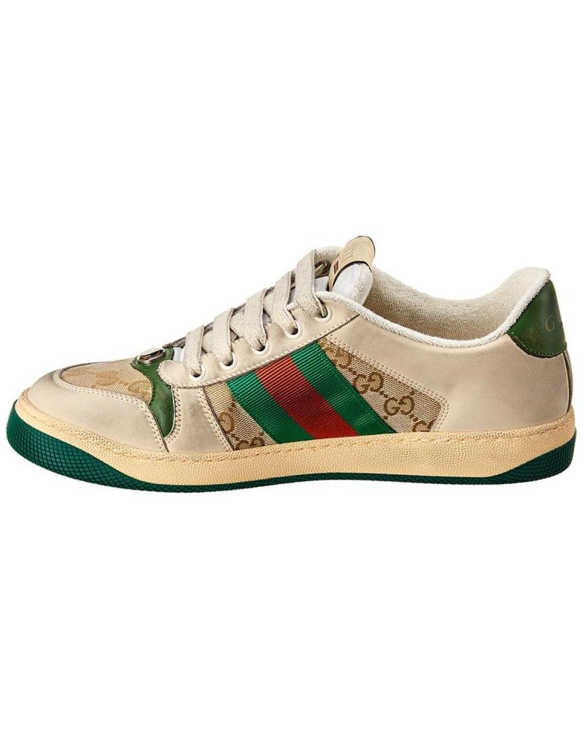 Introducing the Gucci Screener GG Supreme Canvas & Suede Sneaker, a stylish and luxurious addition to any man's shoe collection. This Italian-made sneaker features a unique distressed design with dark silver hardware and the iconic interlocking G logo. The red and green signature webbing detail adds a touch of sophistication to this fashion-forward shoe.Crafted from white suede and beige GG Supreme canvas, this sneaker is both trendy and versatile. The lace-up closure and rubber sole with traction provide comfort and durability for all-day wear. The lightly padded leather insole adds an extra level of luxury to this high-quality shoe.Please note that size selections are in UK sizing, and for US conversions, please reference the size chart. Rest assured that our products are 100% genuine, sourced from trusted independent suppliers. Stand out from the crowd with the Gucci Screener GG Supreme Canvas & Suede Sneaker, where Italian luxury is redefined.