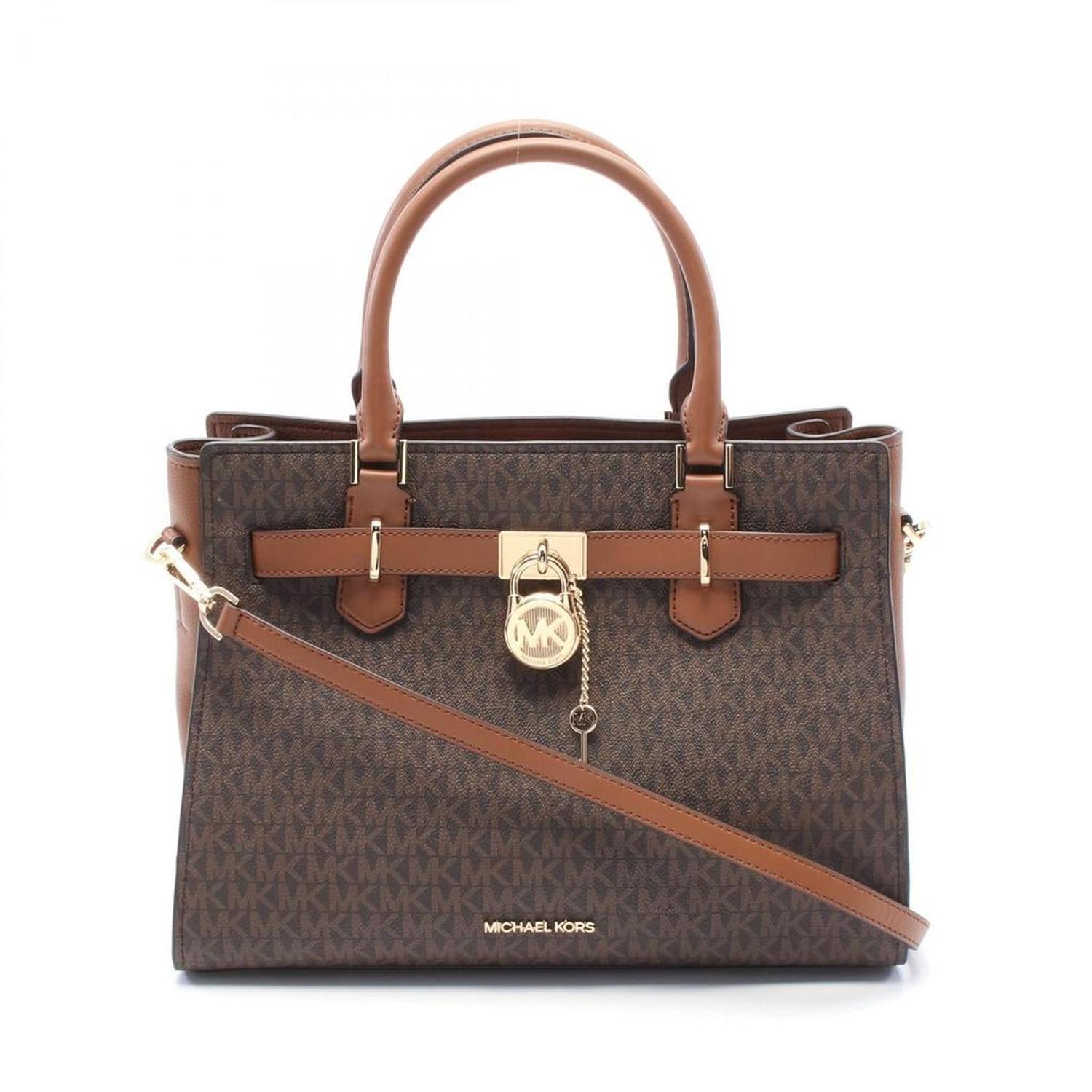 Brand Name Michael Kors; Condition Very Good; Category Bag; SubCategory Handbag; Product Name Michael Kors Hamilton Medium Satchel Handbag; Style Ladies; Accessories Shoulder Strap,Dust Bag; Height (cm) 25; Width (cm) 15; Length (cm) 34; Color Brown; Material PVC coated canvas × leather ; Measurements - width - 150 mm length - 340 mm height - 250 mm