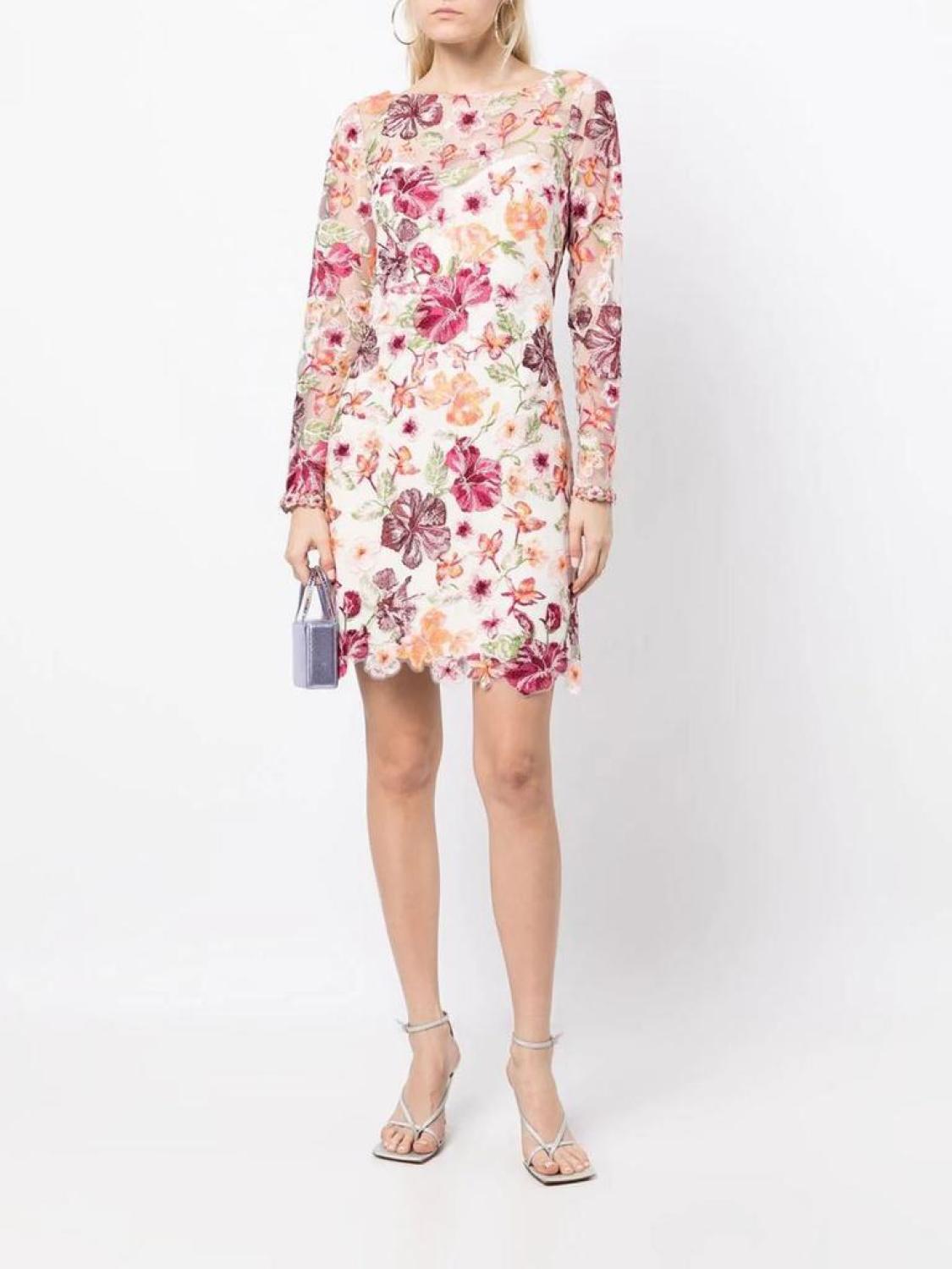The epitome of beauty, this cocktail gown in ivory features a sheer full-sleeved boat neckline, a bodycon silhouette, a low-cut back, and embroidered floral details throughout the body of the dress.Model is wearing size US 0.