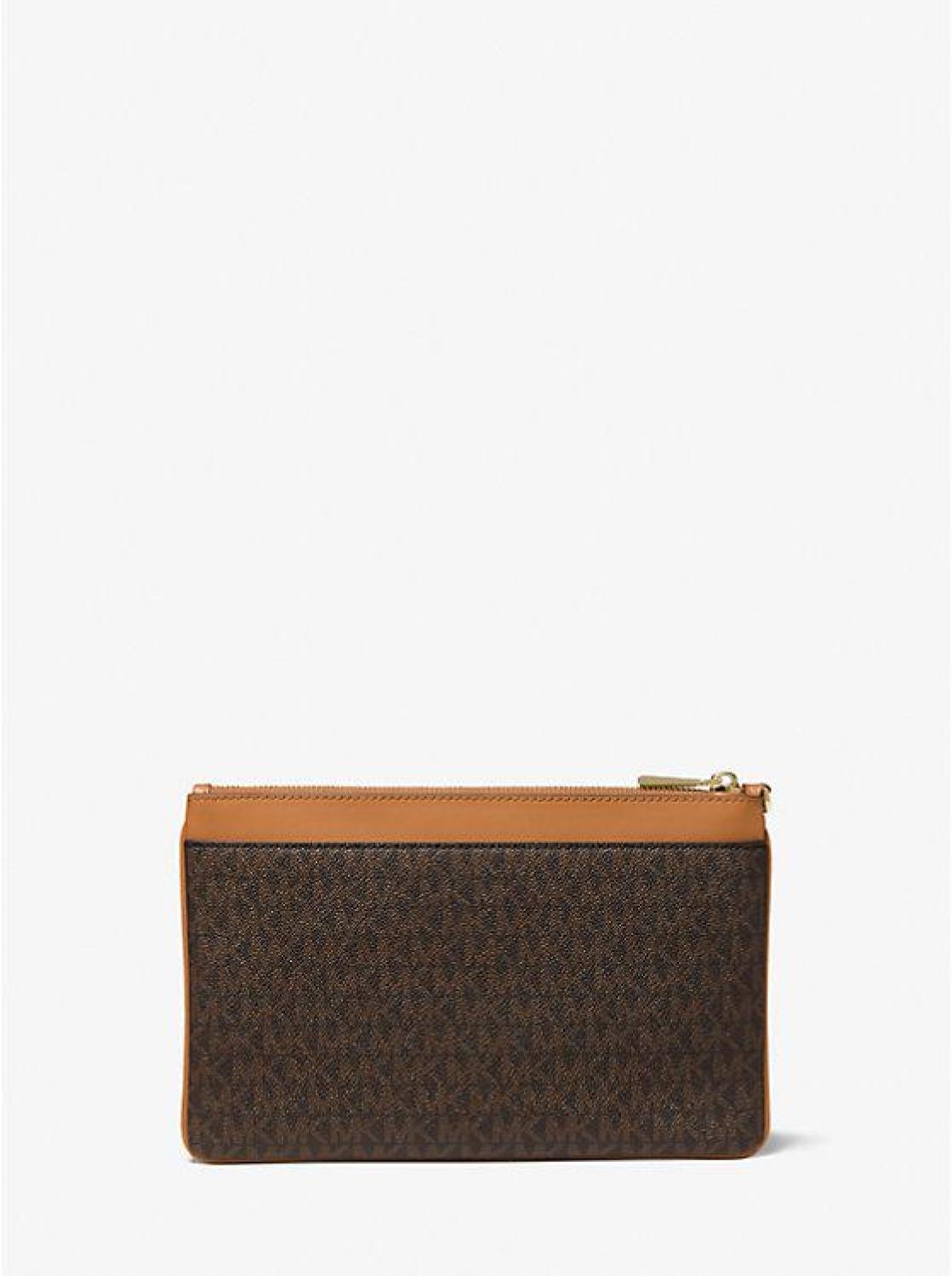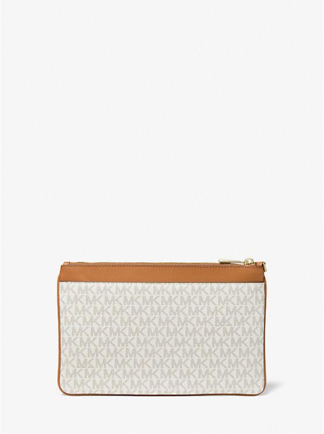 This chic wristlet will keep your essentials within easy reach. Crafted from our classic Signature-print canvas, it features a zip fastening that opens to a roomy interior equipped with a slip pocket and ample card slots. Carry it alone by the smooth leather strap when you want to travel light, or toss it into the coordinating tote.