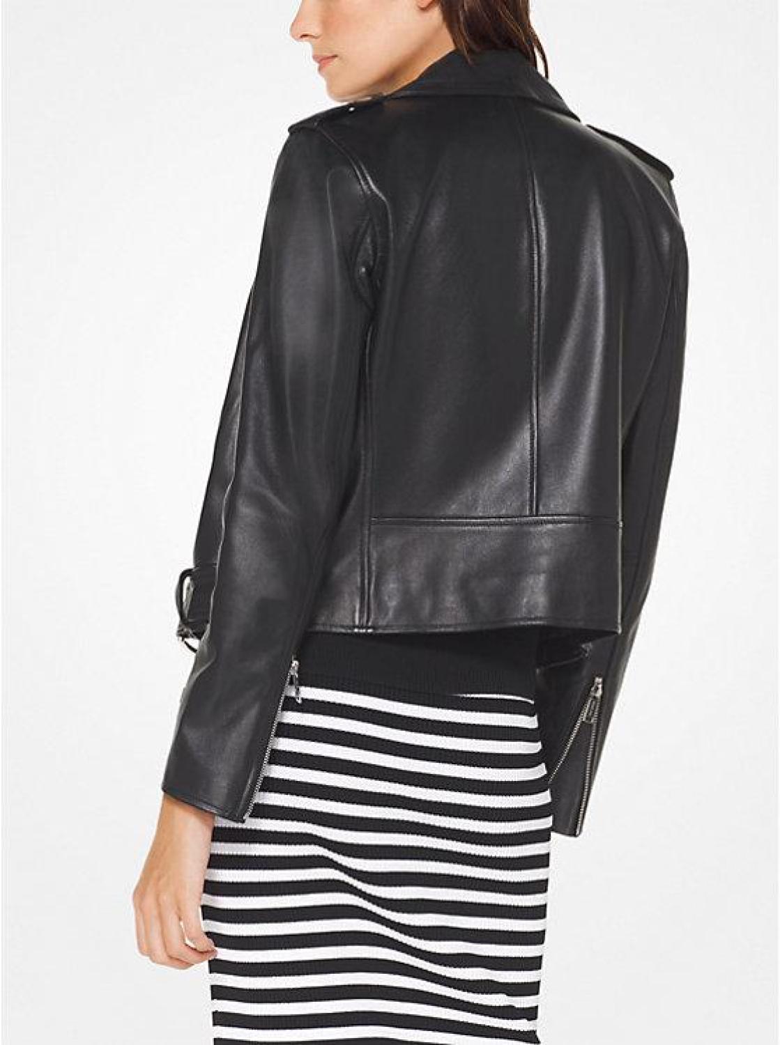 • A love-forever essential, this leather moto jacket is accented with shoulder epaulettes, zipped cuffs and a belted hem for a vintage feel. This inherently edgy style looks especially cool with a bodycon dress and heels.