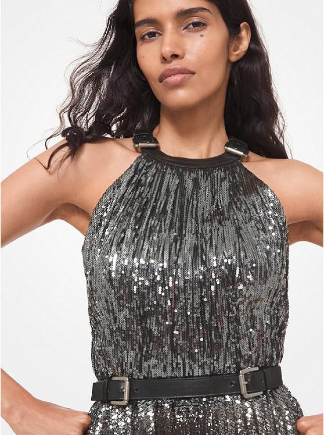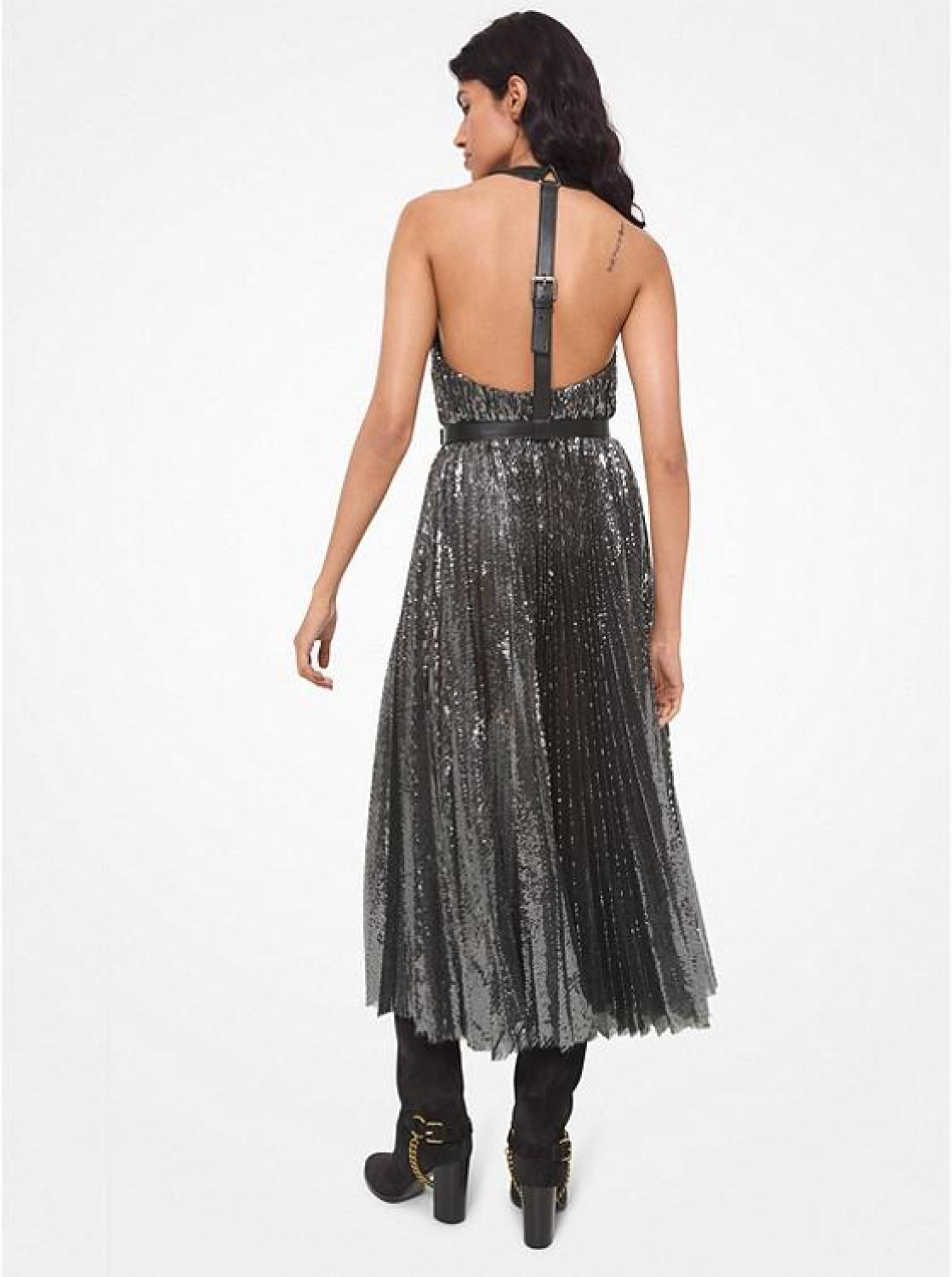 Make an entrance at your next event in this showstopping dress. Sequined tulle is juxtaposed with supple leather strapping that defines its halter neckline and nipped-in waist, while a silk lining provides coverage. Its pleated midi-length skirt finishes the look with graceful movement. Made in Italy. Dress Tulle 100% polyester Lining: 100% silk Dry clean Made in Italy Model is 5’9”/175 cm wearing US size 2 Dress Tulle 100% polyester Lining: 100% silk Dry clean Made in Italy Model is 5’9”/175 cm wearing US size 2