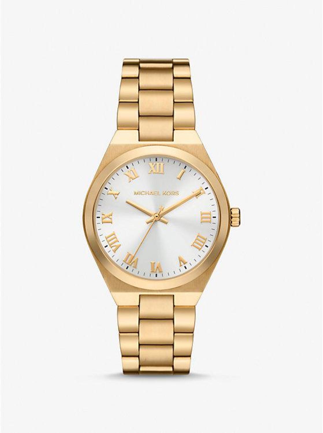 A versatile timepiece with staying power, the Lennox strikes again with a pearlescent dial updated with Roman numeral markers. Gold-tone stainless steel craftsmanship delivers a polished finish and durability. Slip yours on day or night for round-the-clock style. • Mid-sized watch • Stainless steel • Gold-tone hardware • Mid-sized • 37mm case • Quartz/3-hand movement • Clasp fastening • Water resistant up to 5 ATM • 2-year warranty • Imported • Mid-sized watch • Stainless steel • Gold-tone hardware • Mid-sized • 37mm case • Quartz/3-hand movement • Clasp fastening • Water resistant up to 5 ATM • 2-year warranty • Imported