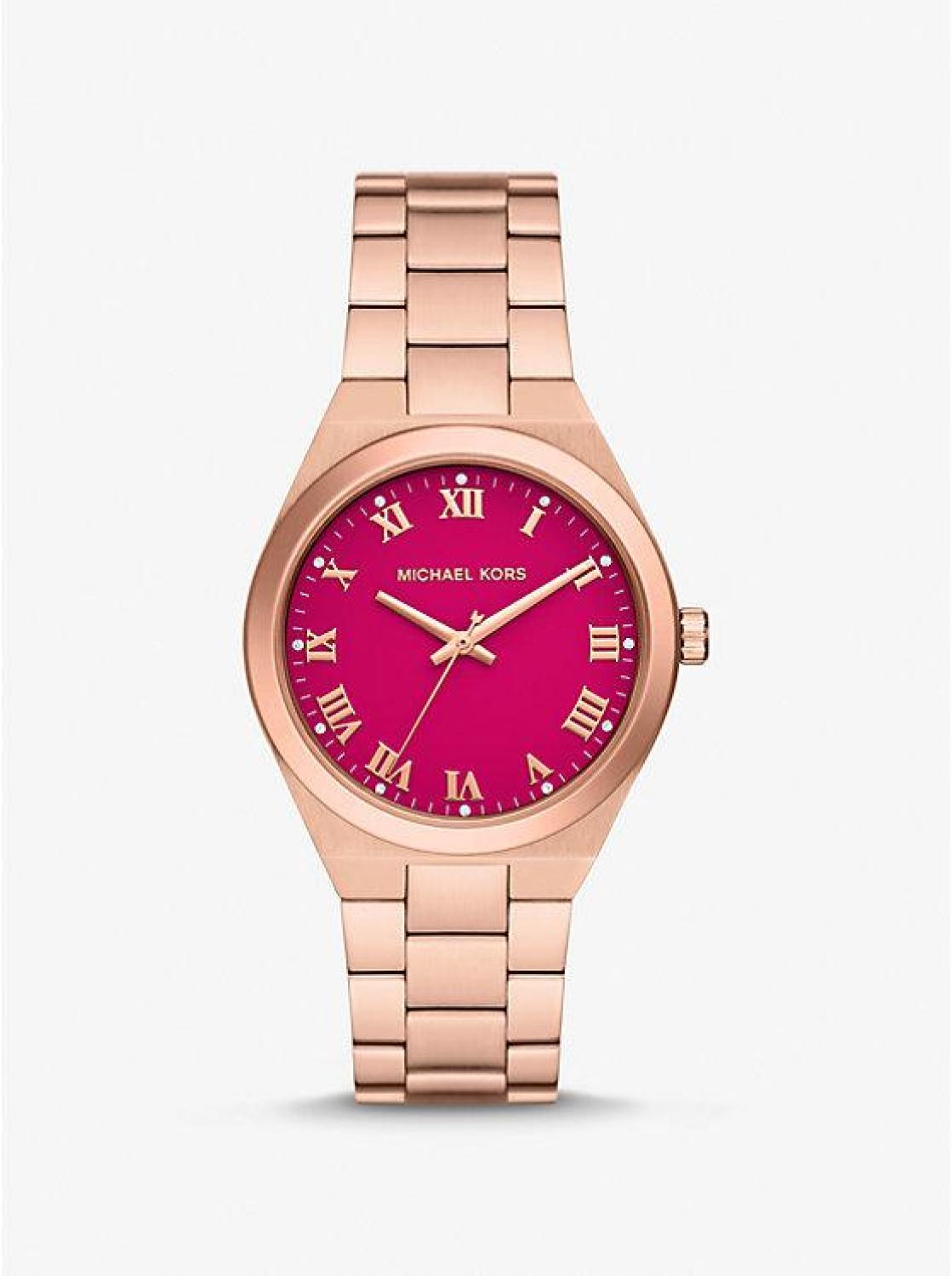 A versatile timepiece with staying power, the Lennox strikes again with a vibrant pink dial updated with pavé-encrusted Roman numeral markers. Rose gold-tone stainless steel craftsmanship delivers a polished finish and durability. Slip yours on day or night for round-the-clock style.