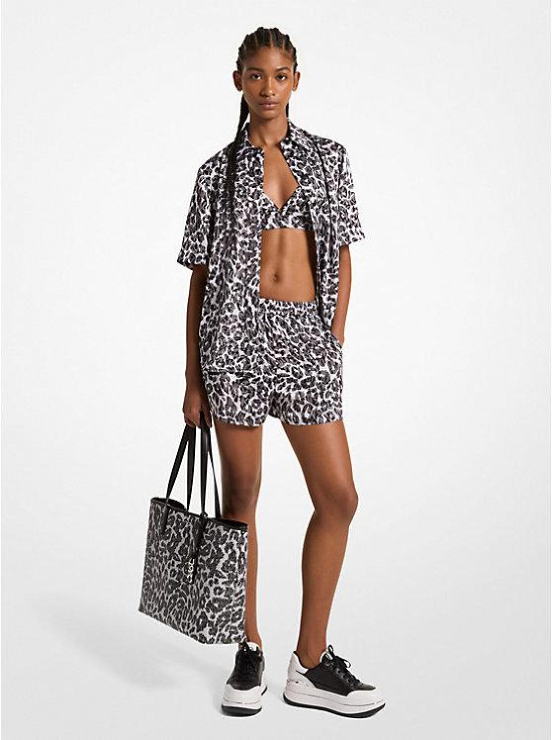 In a silky leopard and logo printed satin, this camp shirt is an easy pick for insouciant style. With a rich array of styling options, it looks just as chic buttoned up as it does worn over a bra top. • Shirt • Satin • 100% polyester • Button fastening • Machine wash • Imported • Model is 5'9"/175 cm wearing size XS • Shirt • Satin • 100% polyester • Button fastening • Machine wash • Imported • Model is 5'9"/175 cm wearing size XS