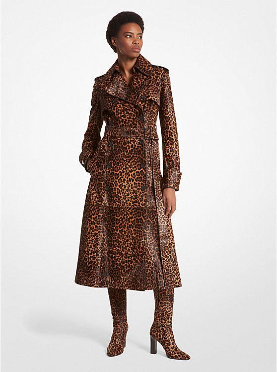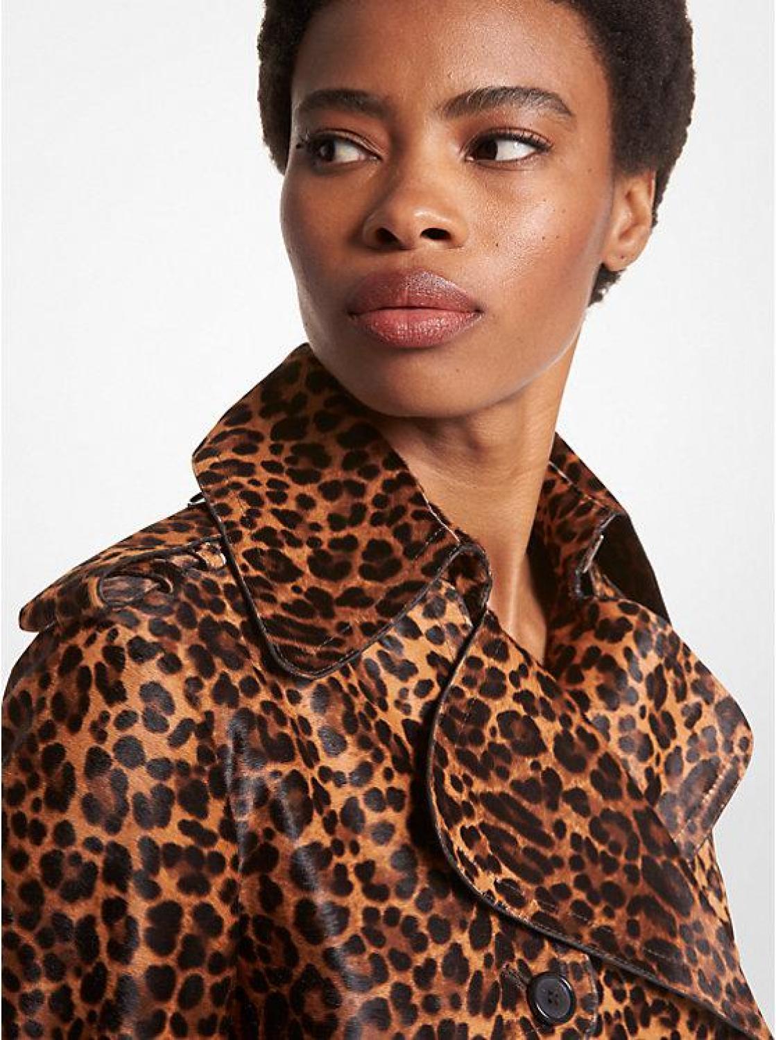 • An eye-catching number from the Fall/Winter 2023 runway, this bold trench coat is crafted in Italy from tactile calf hair printed with a leopard motif. Complementary buttons, a detachable belt and buttoned epaulettes further its classic appeal. Style it with our matching Carly boots for a monochromatic look that feels fresh for the season.