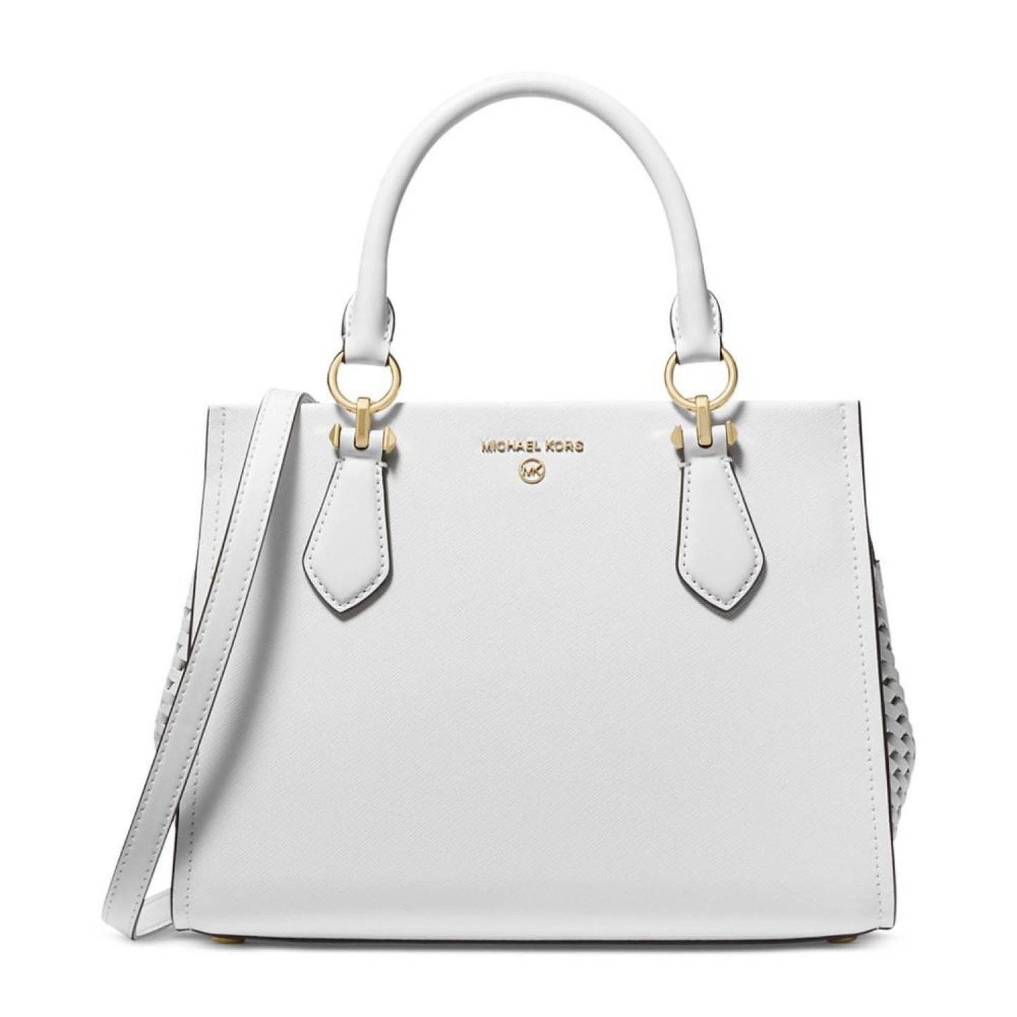 Crafted in leather with lovely woven sides, this satchel by MICHAEL Michael Kors is an accessory that is always in style from season to season. Small sized bag; 11-1/4"W x 8-1/4"H x 5-1/2"D (width is measured across the bottom of handbag); 1.68 lbs. approx. weight Silhouette is based off 5'9" model 4-1/2"L handles; 24"L adjustable, removable strap Zippered closure Hardware tone varies by color, logo plaque at front, front & back exterior slip pockets, interior zip pocket Leather; lining: polyester; trim: leather; trim 2: polyurethane, cotton, polyester Spot clean Imported