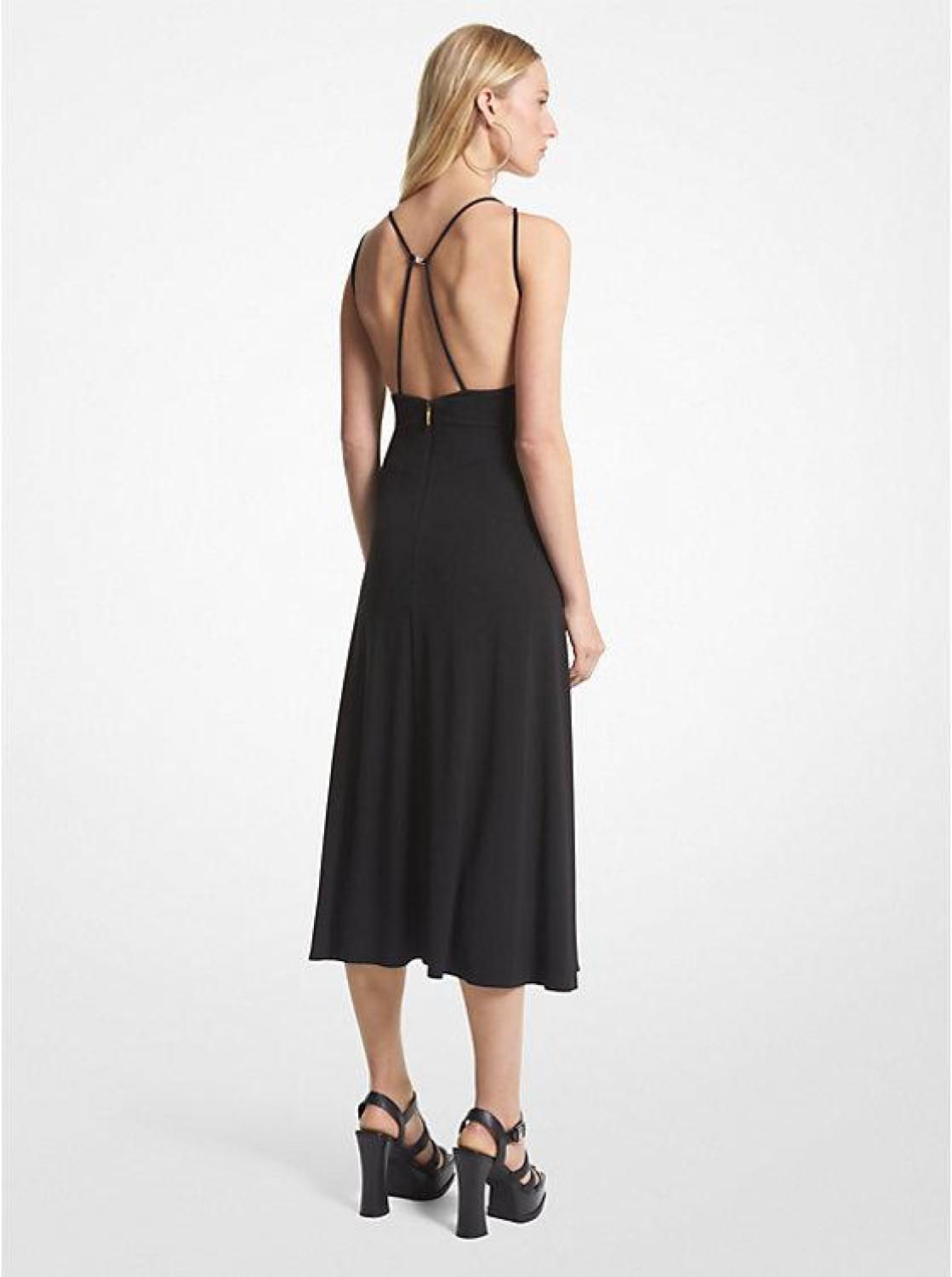 • This dress features a cutout neckline that exudes subtle sensuality. Cut from matte jersey, it’s designed with spaghetti straps that anchor signature charms and reveal flashes of skin. The midi skirt moves gracefully with every step, further highlighting your favorite pair of heels.