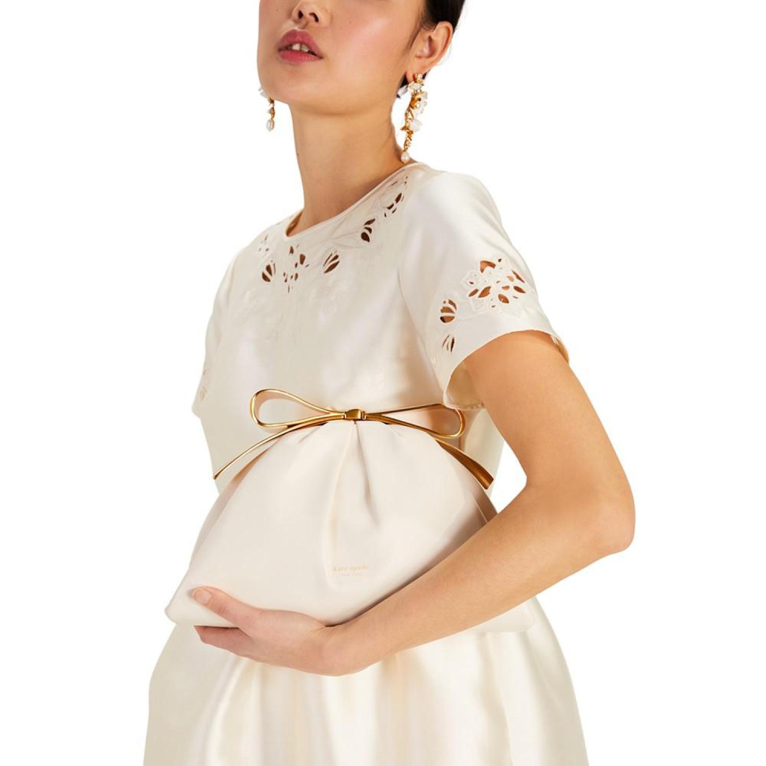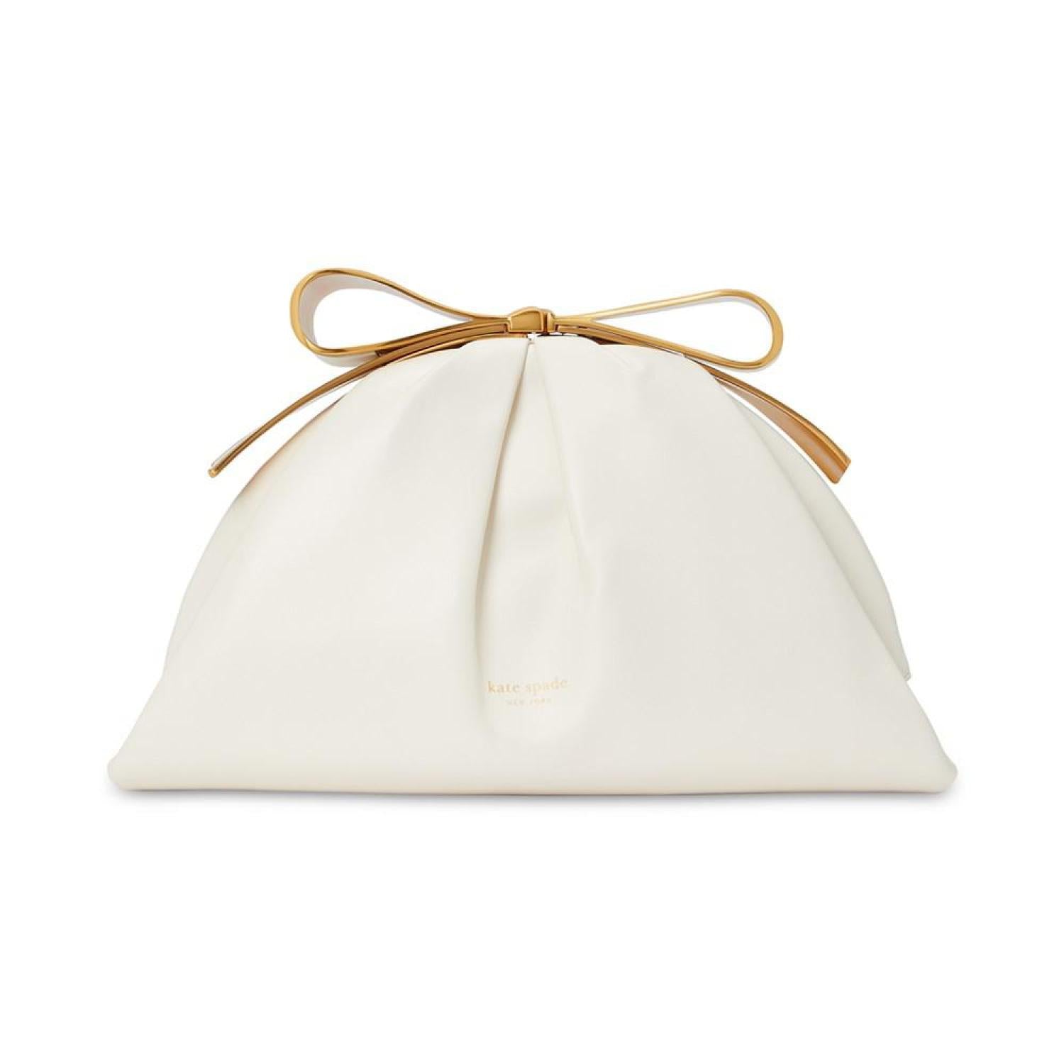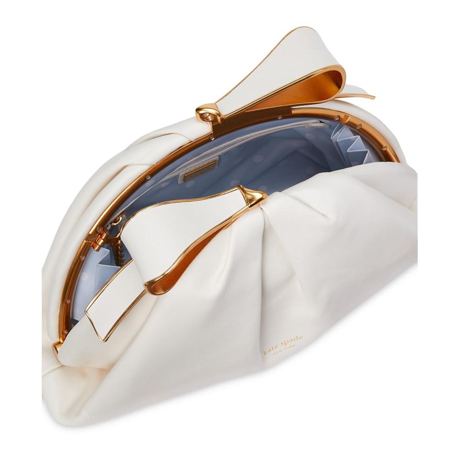 Pearlized leather brings a luster and elegance to this bridal clutch from kate spade new york. Medium sized bag; 12-2/5"W x 6-9/10"H x 2-3/4"D (width is measured across the bottom of handbag) Silhouette is based off 5'9" model Frame closure Gold-tone hardware Interior zip pocket Leather Spot clean Imported
