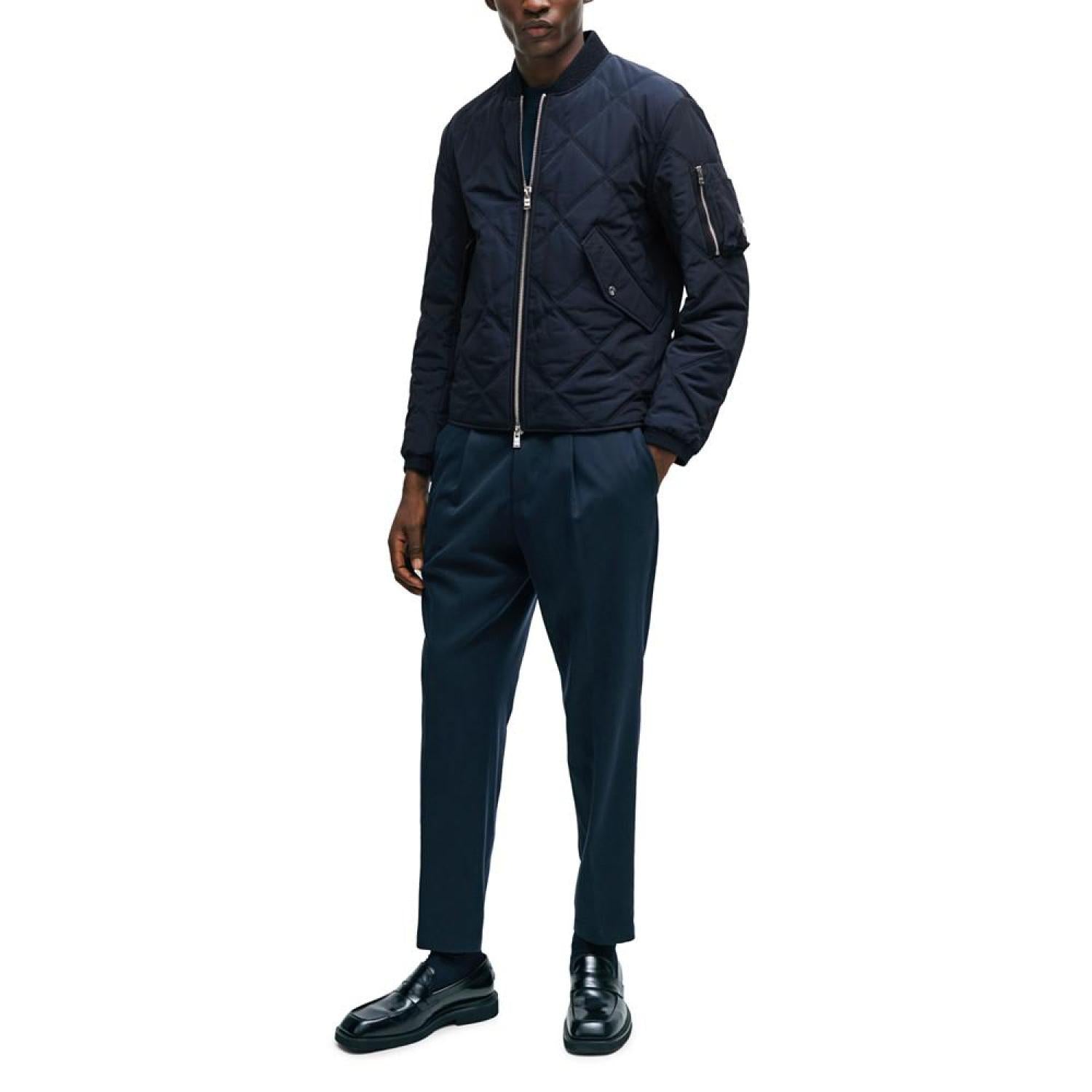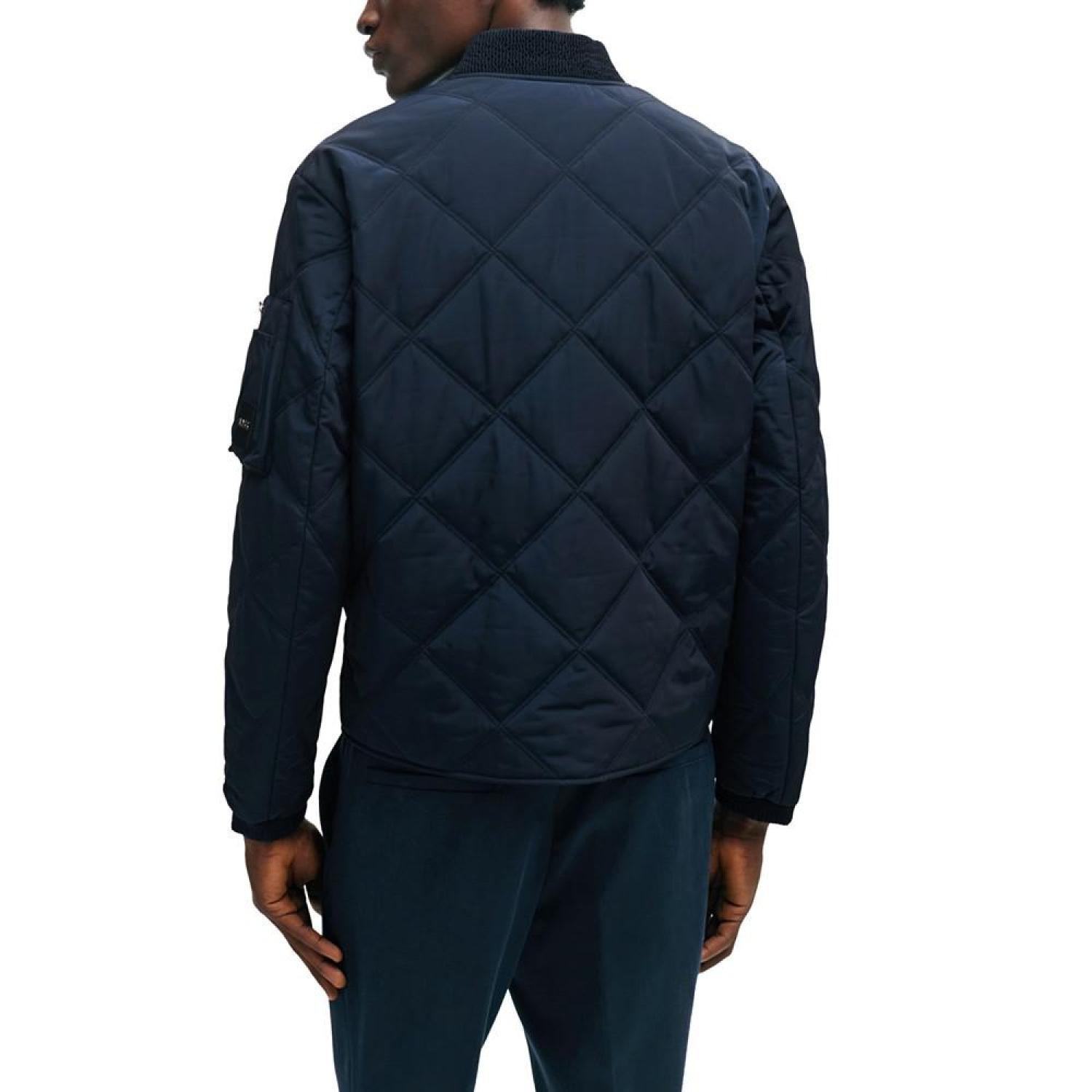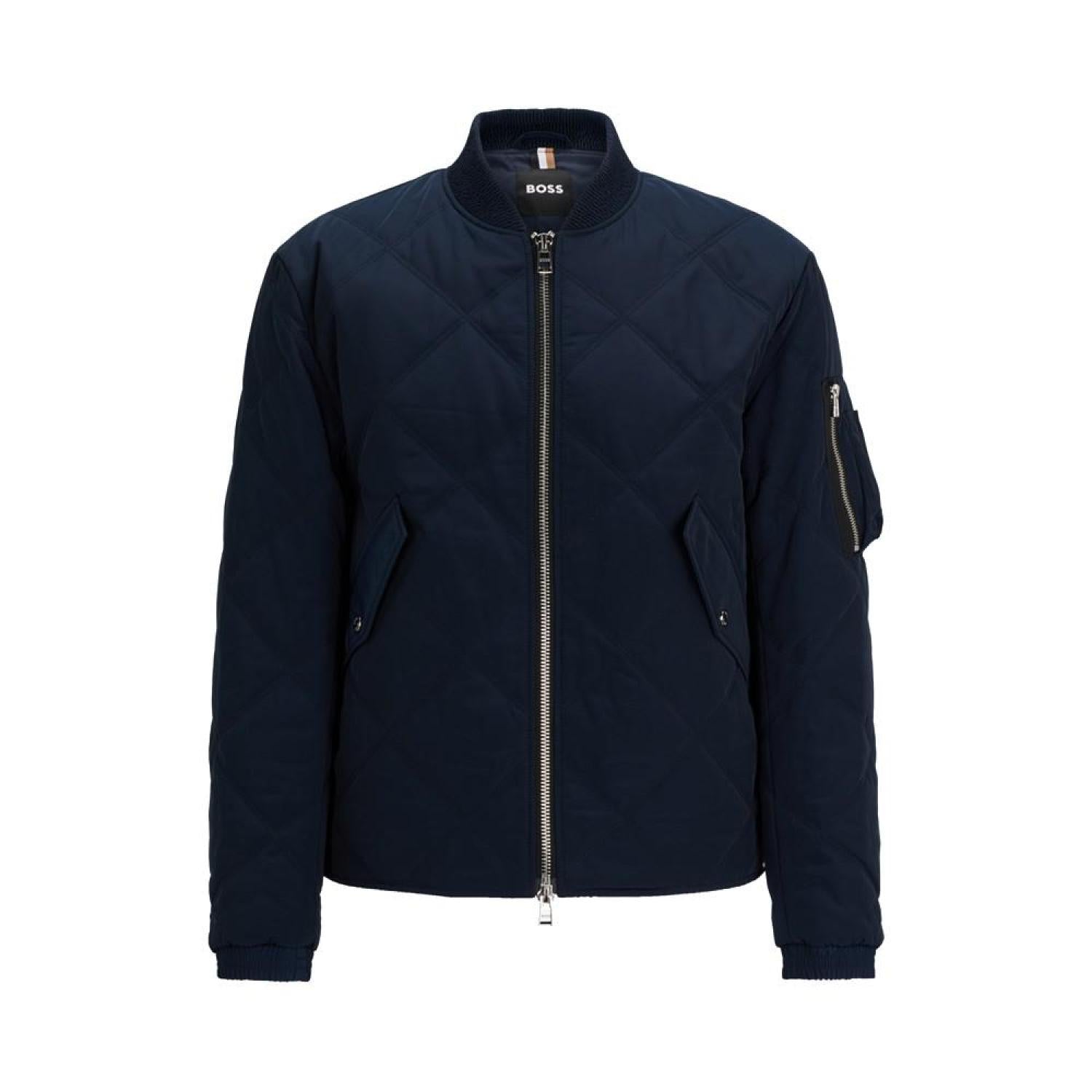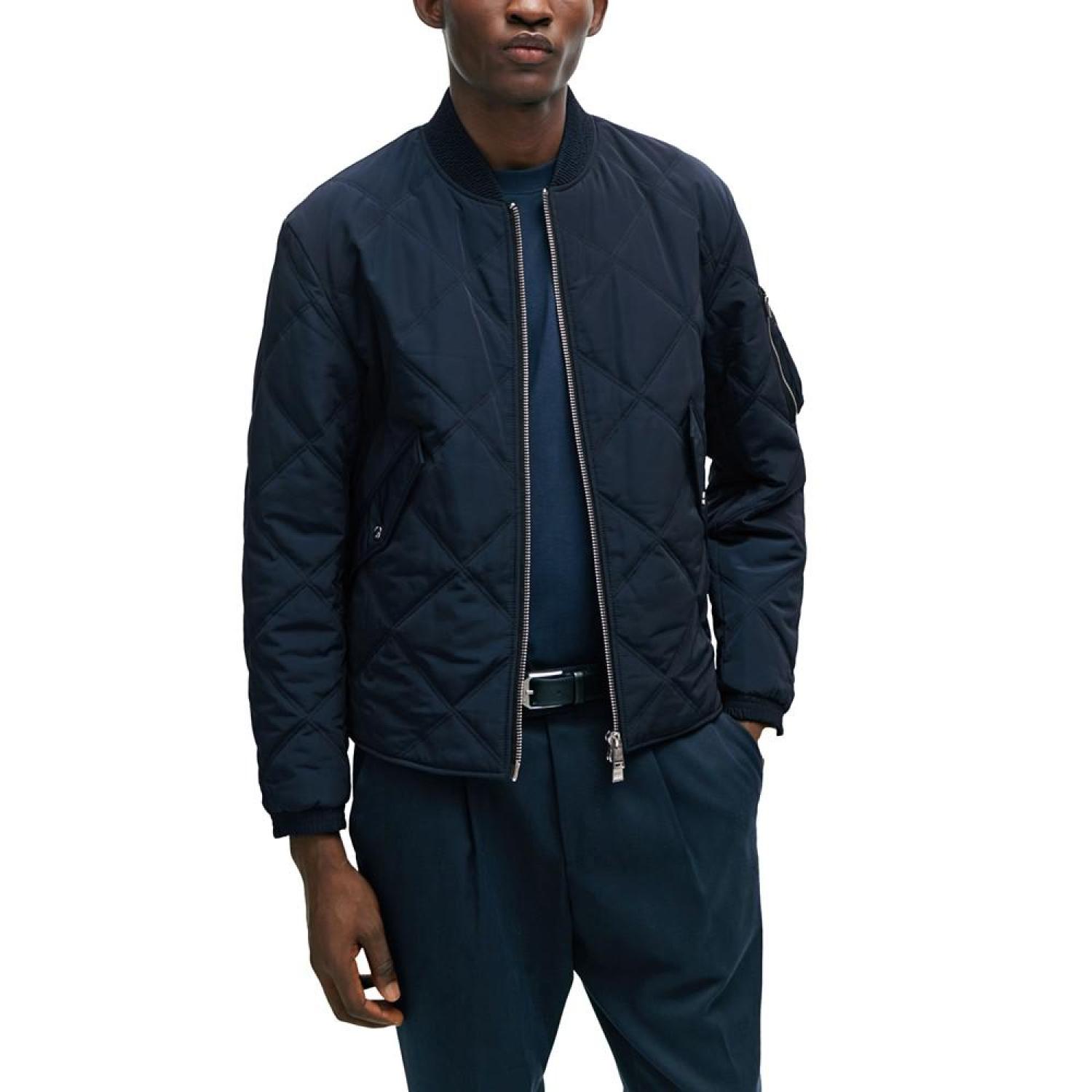 A modern diamond-quilted jacket cut to a regular fit with a college collar and zipped sleeve pocket by BOSS Menswear. The model is a size 32R and is 6'2" tall with a, 38" chest, 29" waist and 36" hips Regular fit Stand collar Fastening top- Zip closure Pockets top- Flap pockets Inside zip pockets Polyester Machine Washable Imported