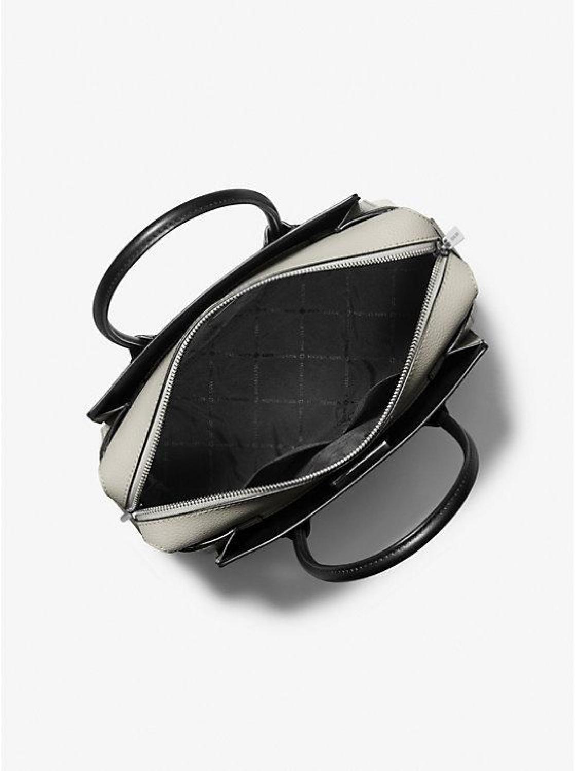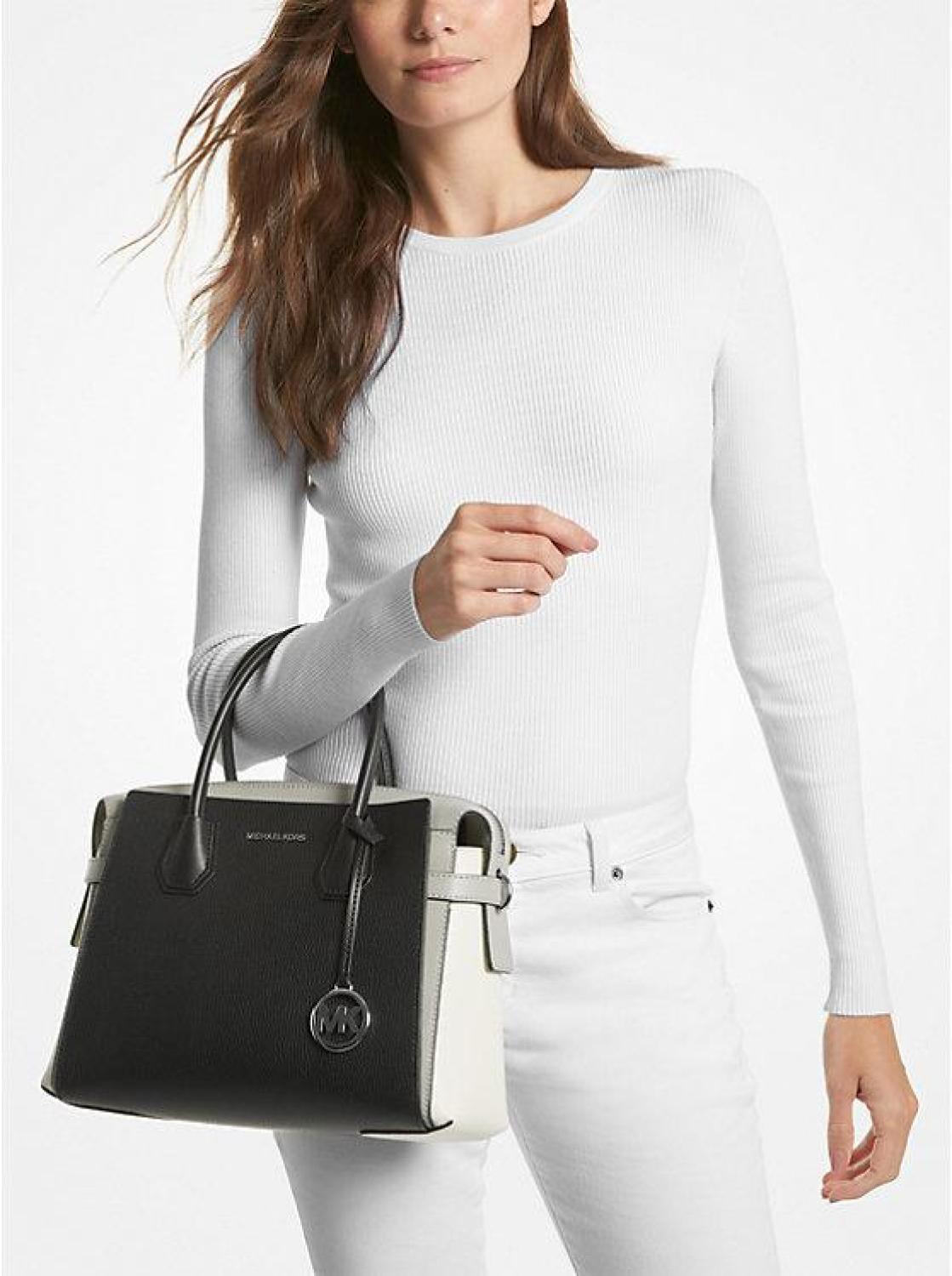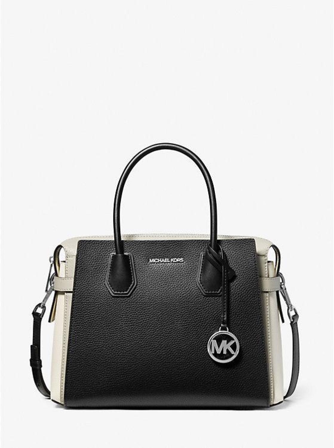 • The color-blocked leather Mercer satchel proves that style in the details. The belted silhouette opens to reveal a spacious interior with slip pockets for your phone and wallet, while the removable strap can be removed to be carried by the top handles. Carry yours day or night.