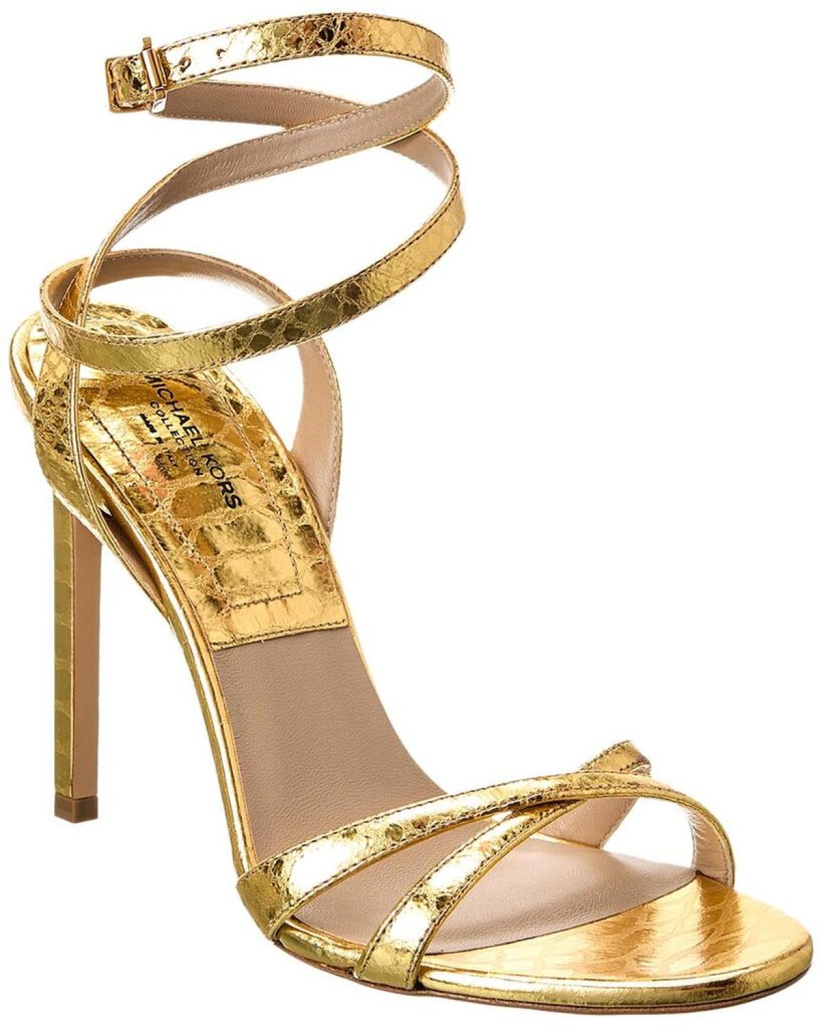 • Elevate your summer style with the Michael Kors Collection Chrissy Runway Leather Sandal. This glamorous sandal features gold embossed leather and gold-tone hardware with a chic strappy design. The adjustable ankle strap with buckle closure ensures a perfect fit, while the lightly padded leather insole keeps you comfortable all day long. The smooth leather sole and 4.5-inch heel add an extra touch of luxury to this Italian-made sandal. Whether you're hitting the town or heading to a special event, these sandals are sure to make a statement. Embrace all-American style with Michael Kors Collection and step out in easy glamour and luxurious living. Size selections are European, please reference the size chart for US conversions.