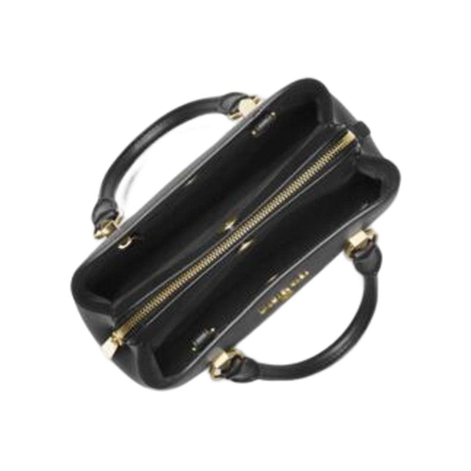 • Made of PVC Signature or Saffiano leather, Open top, Zip closure middle compartment, Leather pull and Logo detail on front, Inside zip pocket and one open pocket. Brand-name leather in metal detail on front, Adjustable, detachable Leather shoulder strap with 18 Inch to 20 Inch drop. Double Rolled leather handles with 4.5 Inch drop, Gold hardware, Model - EDITH. Measurements - Length - 10.5 x Height - 7.25 x Width - 4 Inches. Comes with original tags.