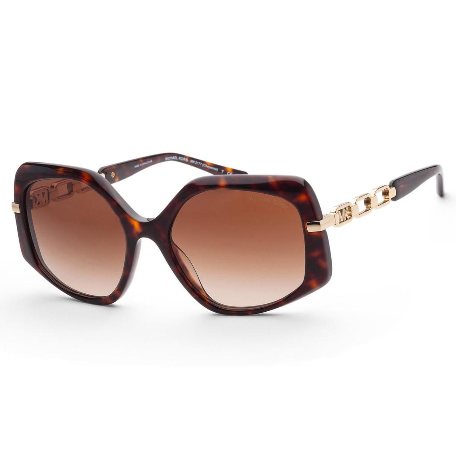 The Michael Kors women's Sunglasses measure at 56 mm lens width, 19 mm bridge width, and 140 mm arm length. The frame is square-shaped dark tortoise acetate. The lenses are non-polarized brown gradient. Made in China (MK2177-300613-56)