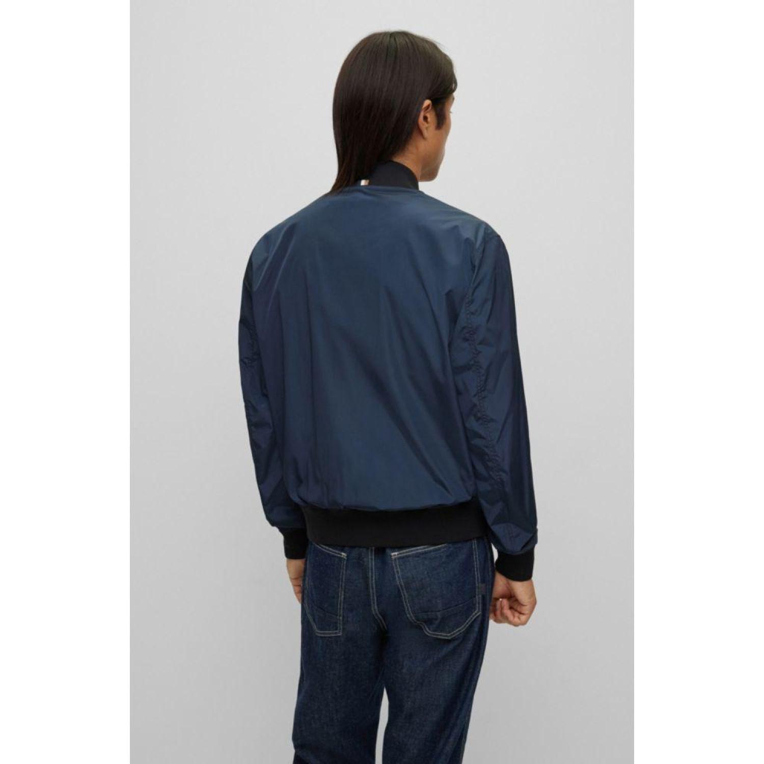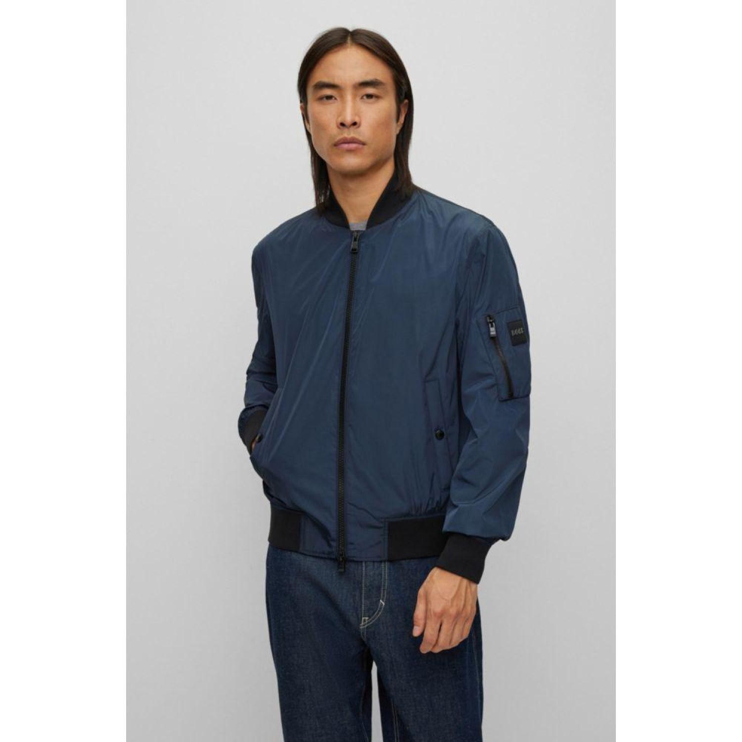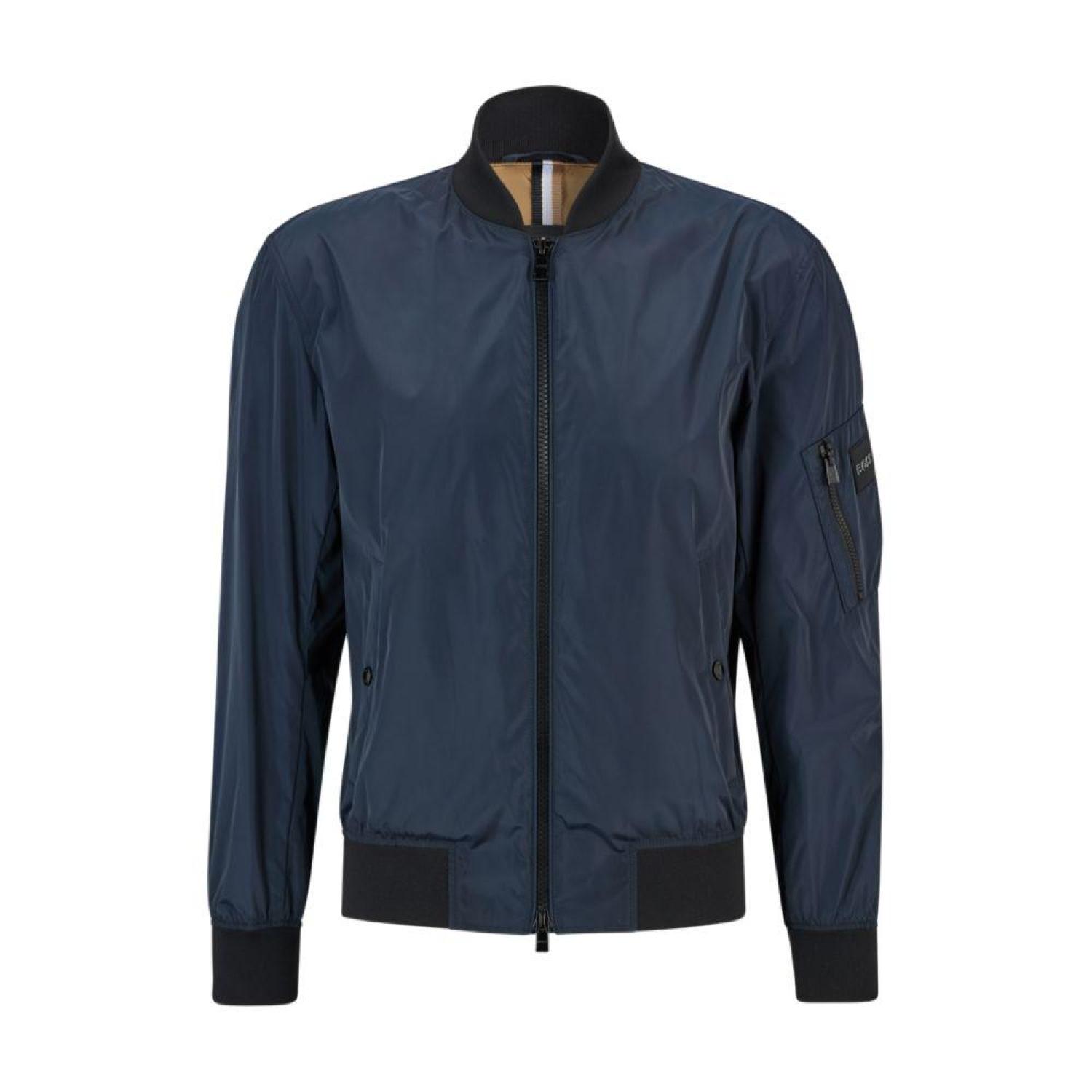 An authentic bomber jacket with stretch ribbing by BOSS Menswear. Featuring a signature stripe at the rear collar, this bomber jacket is cut to a regular fit and treated with a water-repellent finish.