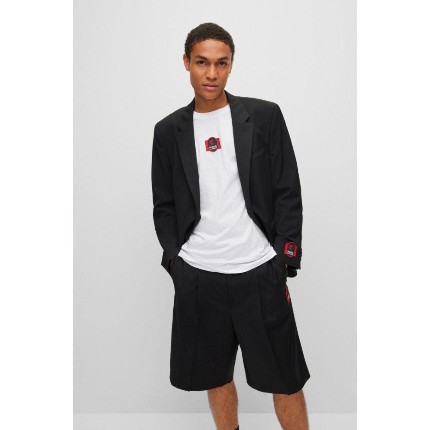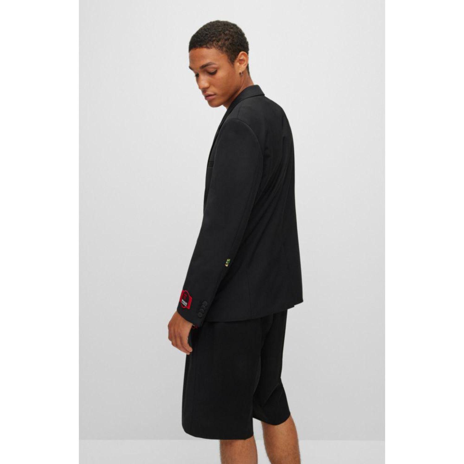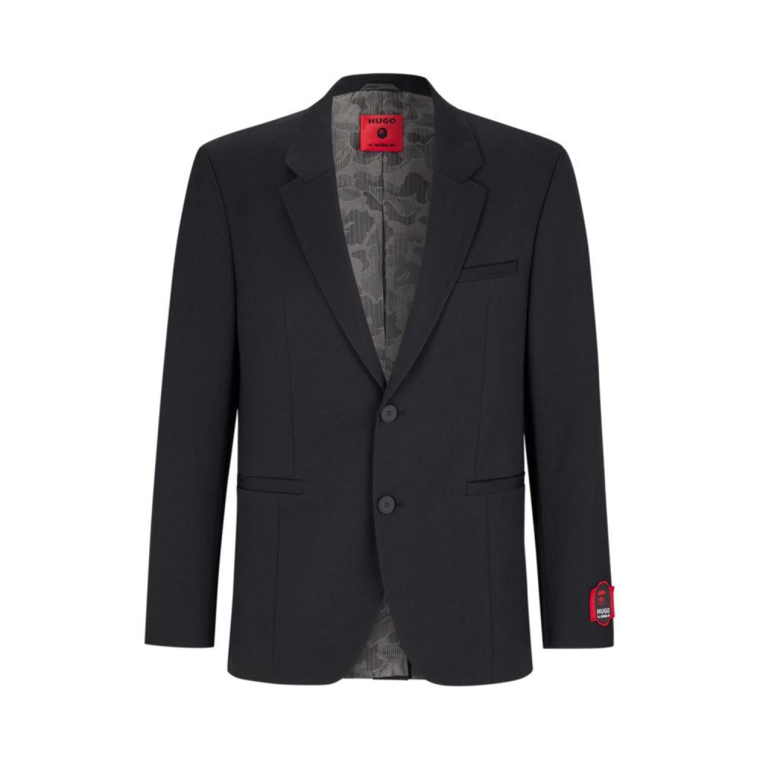 A cutting-edge jacket by HUGO Menswear.Tailored to a laid-back fit for a trend-driven silhouette, this single-breasted jacket is trimmed with collaborative branding at the left sleeve for a typical twist. The twill fabric is rich in virgin wool and features stretch for comfort. HUGO x MR. BATHING APE - Berlin attitude meets Tokyo realness. Introducing a collection of our brand signatures reinterpreted with a classic streetwear vibe. A free HUGO x Mr. Bathing Ape sticker set is included with this style. This giveaway is only offered in the following countries - Germany, Austria, Netherlands, Belgium, and Spain.Material - paperSize - different sizes