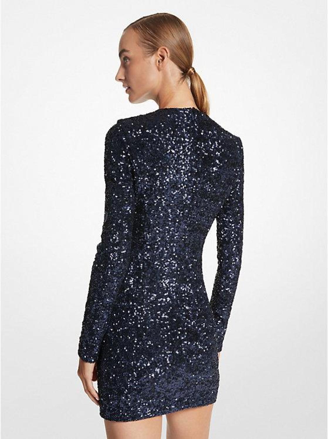 Sequined Stretch Tulle Long-Sleeve Dress