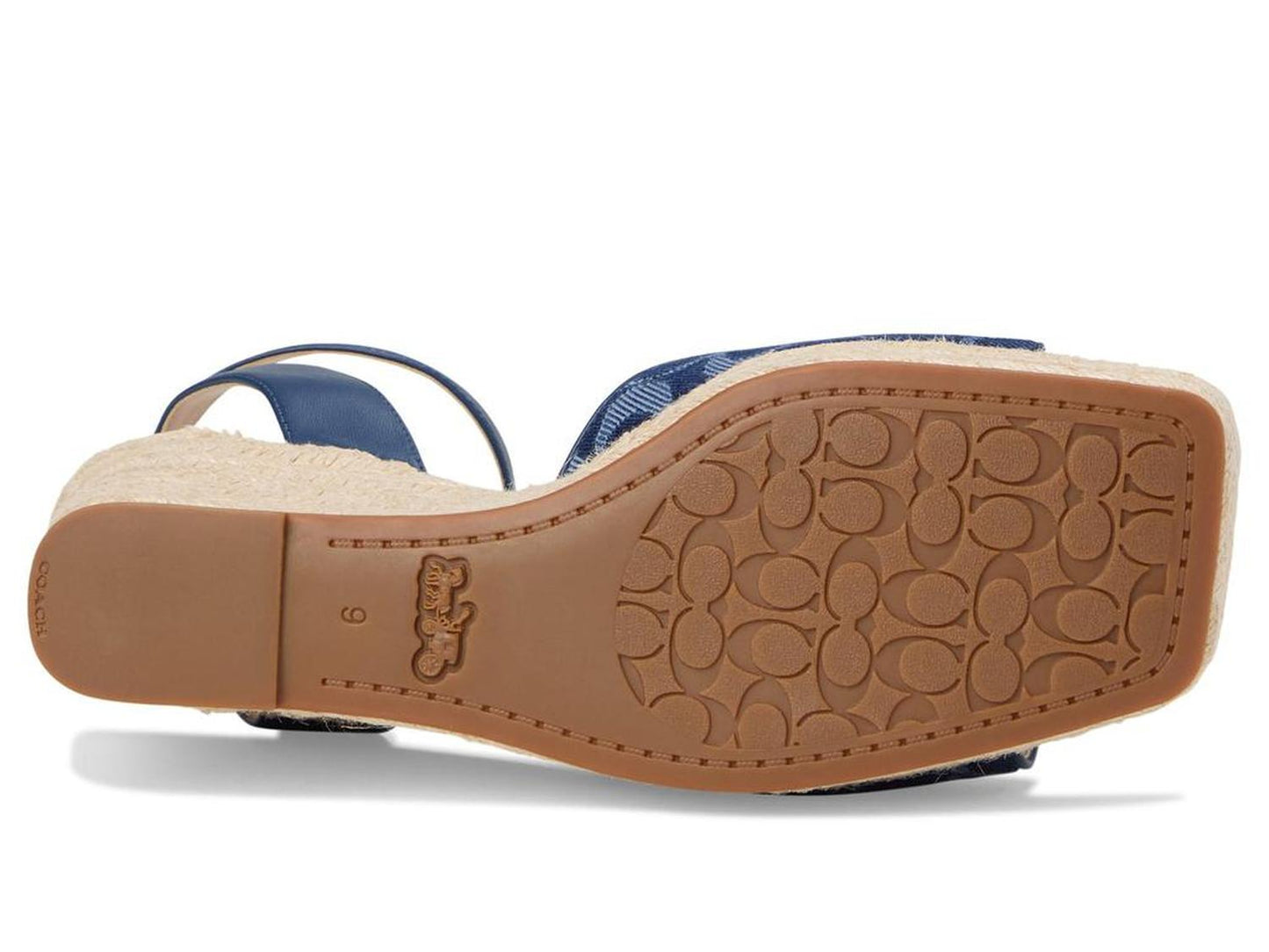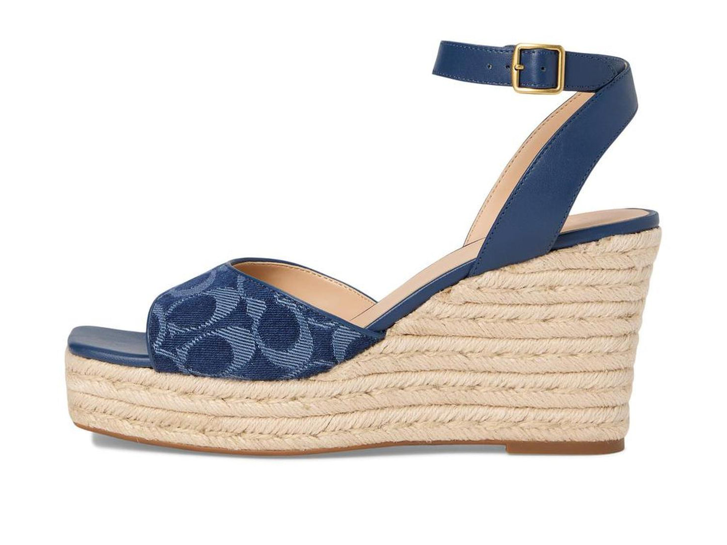 Step into elegance wearing the COACH® Signature C Espadrille Wedge. Crafted from signature denim and leather upper, faux leather lining, and rubber insole, this pair of sandals features open square toe, ankle strap, buckle closure, wedge heel, and brand detailing on the footbed.