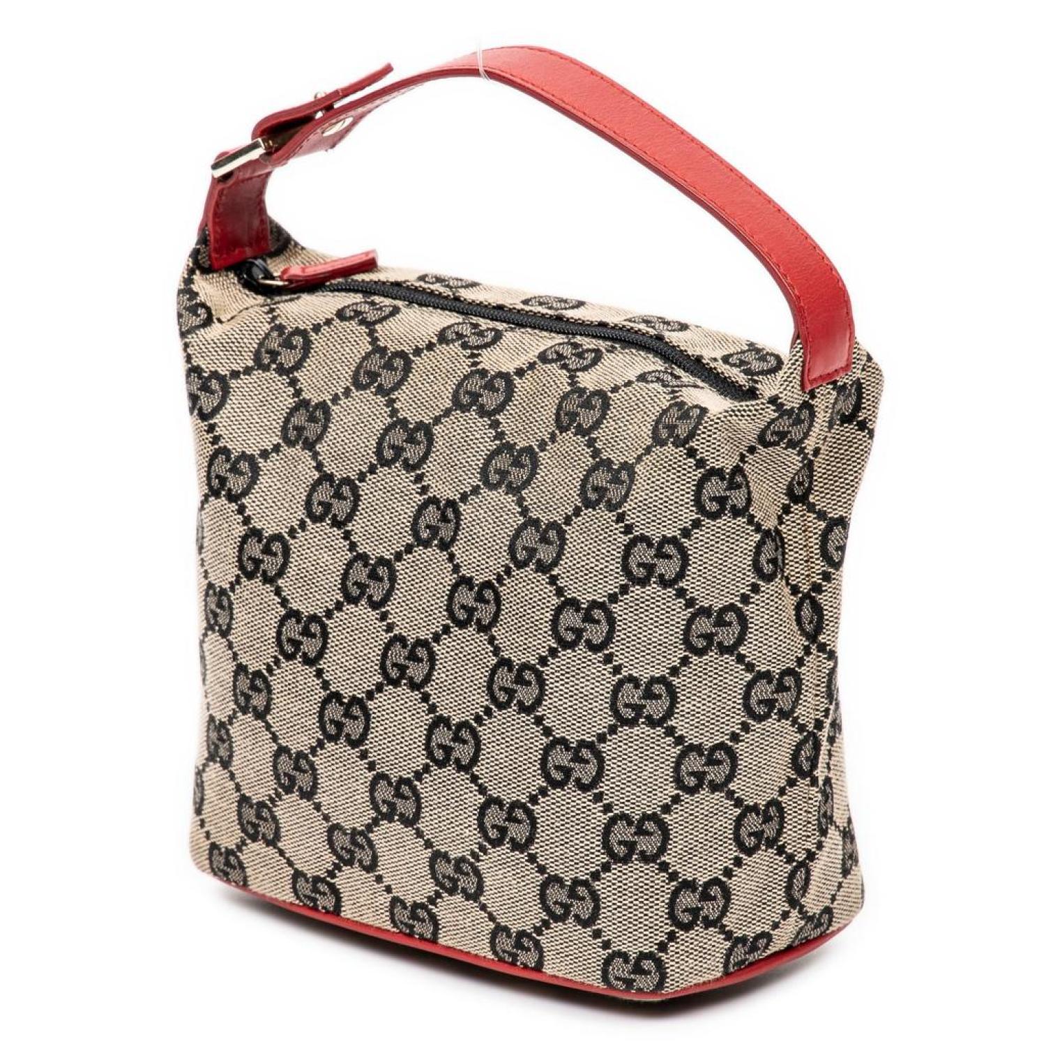 • Gucci Handbag in Beige/Red Monogrammed Canvas and Gold hardware. Dimensions - 15*12*7cm. Serial number - 039-1147-002122. Inclusions - None.