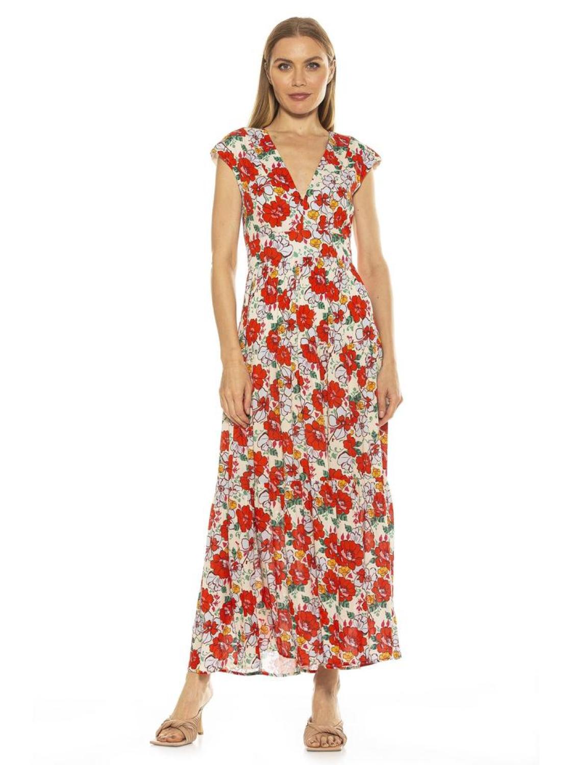 PRODUCT FEATURES Fit - This style fits true to size. V-neck Short sleeves Maxi length tiered skirt Fiber Content 100%Â Rayon Lined - 100% Polyester Machine wash Imported Style D3646